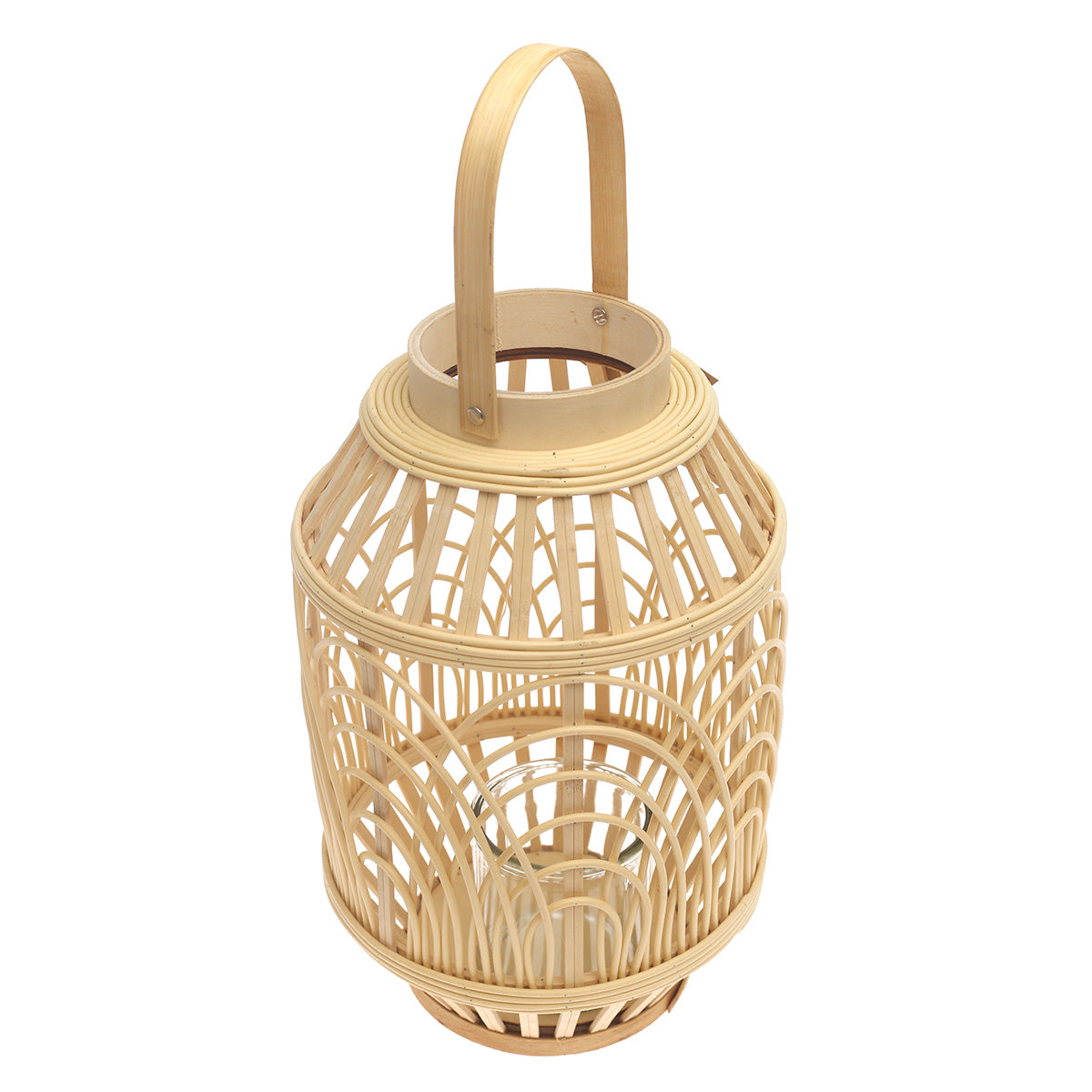 Bring natural warmth and effortless elegance into your space with this Medium Natural Handcrafted Hanging Lantern. Measuring 14 inches in height, this beautifully designed lantern features a smooth bamboo-style frame with an artistic arched open-weave pattern that softly diffuses light. The natural finish and curved silhouette create a calm, organic look that blends seamlessly with boho, coastal, farmhouse, and minimalist interiors. Designed with a sturdy bamboo handle, this lantern can be hung or placed on the floor or tabletop to create a cozy, inviting atmosphere using LED candles or decorative lights.