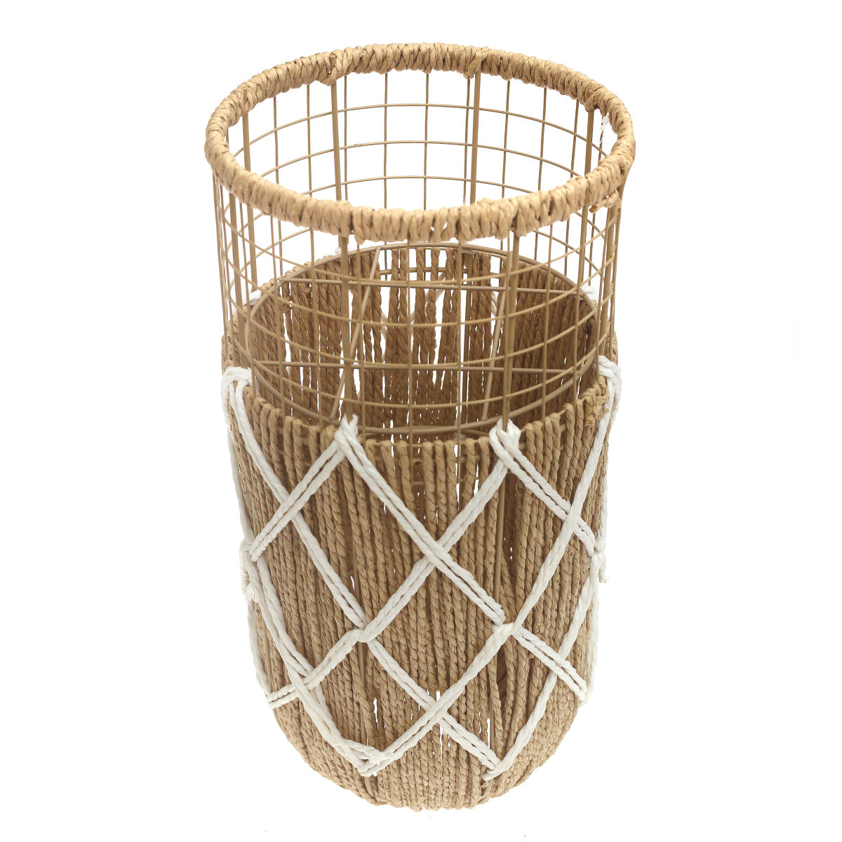 Bring a touch of natural elegance to your home with this Small White Handwoven Floor Vase, designed to add texture and visual interest without overwhelming your space. Standing 19 inches tall, this decorative vase features a natural rope-wrapped body highlighted with a white crisscross pattern for a clean, modern-meets-boho aesthetic. The open metal-frame top keeps the design airy and contemporary, making it a perfect accent for living rooms, bedrooms, hallways, or entryways. Whether styled with dried florals or displayed on its own, this vase adds warmth and artisanal charm to any décor setting.