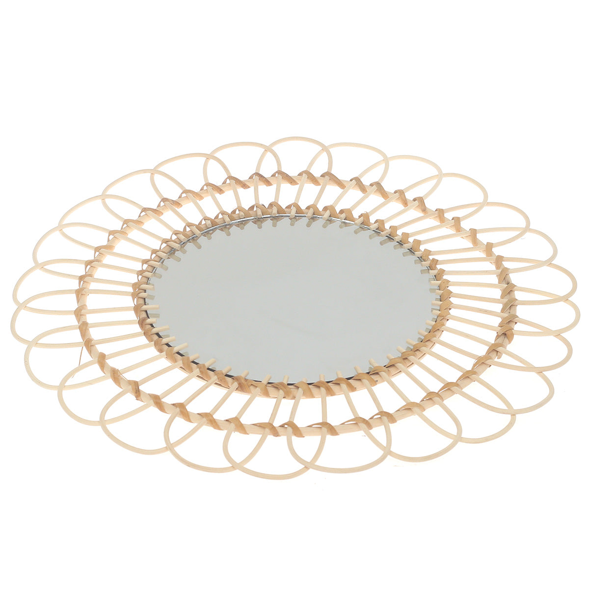 Elevate your wall décor with this Handwoven Natural Bamboo Mirror, designed to blend organic texture with refined craftsmanship. Measuring 18 x 18 inches, this statement mirror features a round glass center framed by an intricate looped bamboo weave that forms a soft, floral-inspired silhouette. The airy design and natural finish bring warmth and visual depth, making it a perfect accent for boho, coastal, Scandinavian, or earthy modern interiors. Ideal for living rooms, bedrooms, entryways, or feature walls, this mirror reflects light beautifully while doubling as functional wall art.