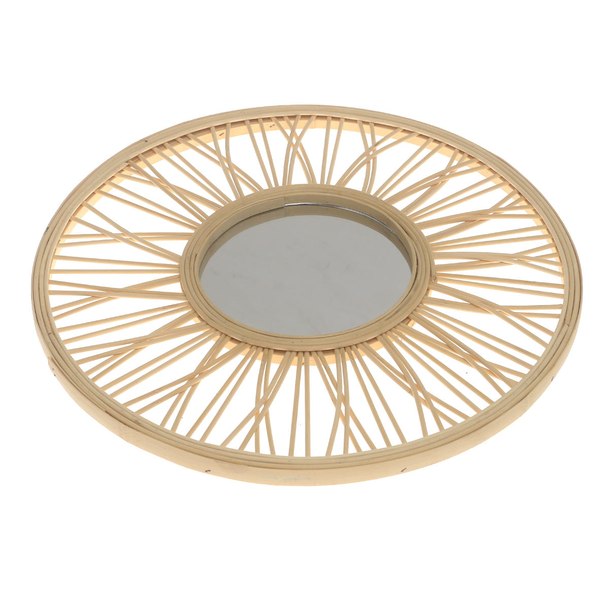 Enhance your walls with natural texture and timeless design using this Handwoven Natural Round Mirror. Measuring 17.5 x 17.5 inches, this statement mirror features a circular glass center surrounded by a finely crafted bamboo-style frame with radiating spoke details. The airy, sunburst-inspired design creates depth and visual movement, making it a perfect accent for boho, coastal, Scandinavian, and earthy modern interiors. Ideal for living rooms, bedrooms, entryways, or feature walls, this mirror reflects light beautifully while adding handcrafted elegance to your décor.