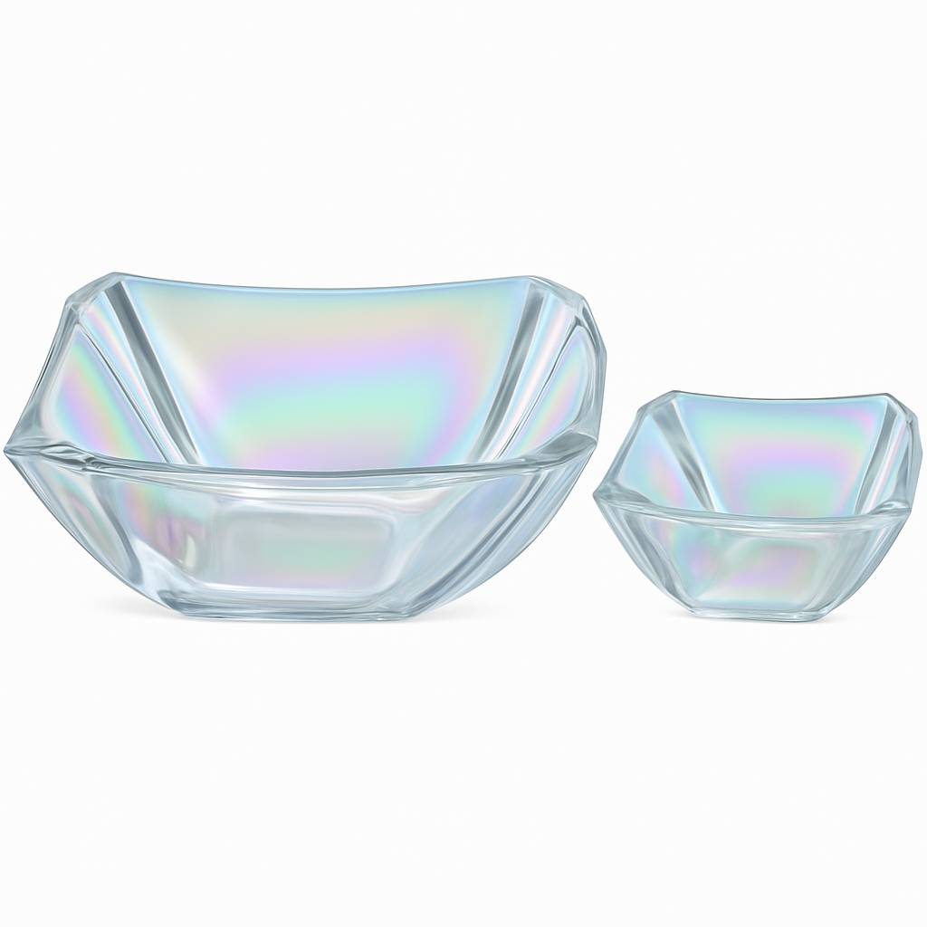 Elevate your serveware collection with this striking 7-piece square-cut fruit bowl set, now available in Silver, Gold and Black colour finishes. Crafted from high-quality pressed glass with an eye-catching iridescent sheen, each bowl reflects light beautifully, adding a modern, luxurious touch to any table setting. Whether used for serving fruits, snacks, desserts or as a decorative display piece, this set delivers sophistication, versatility and premium craftsmanship.