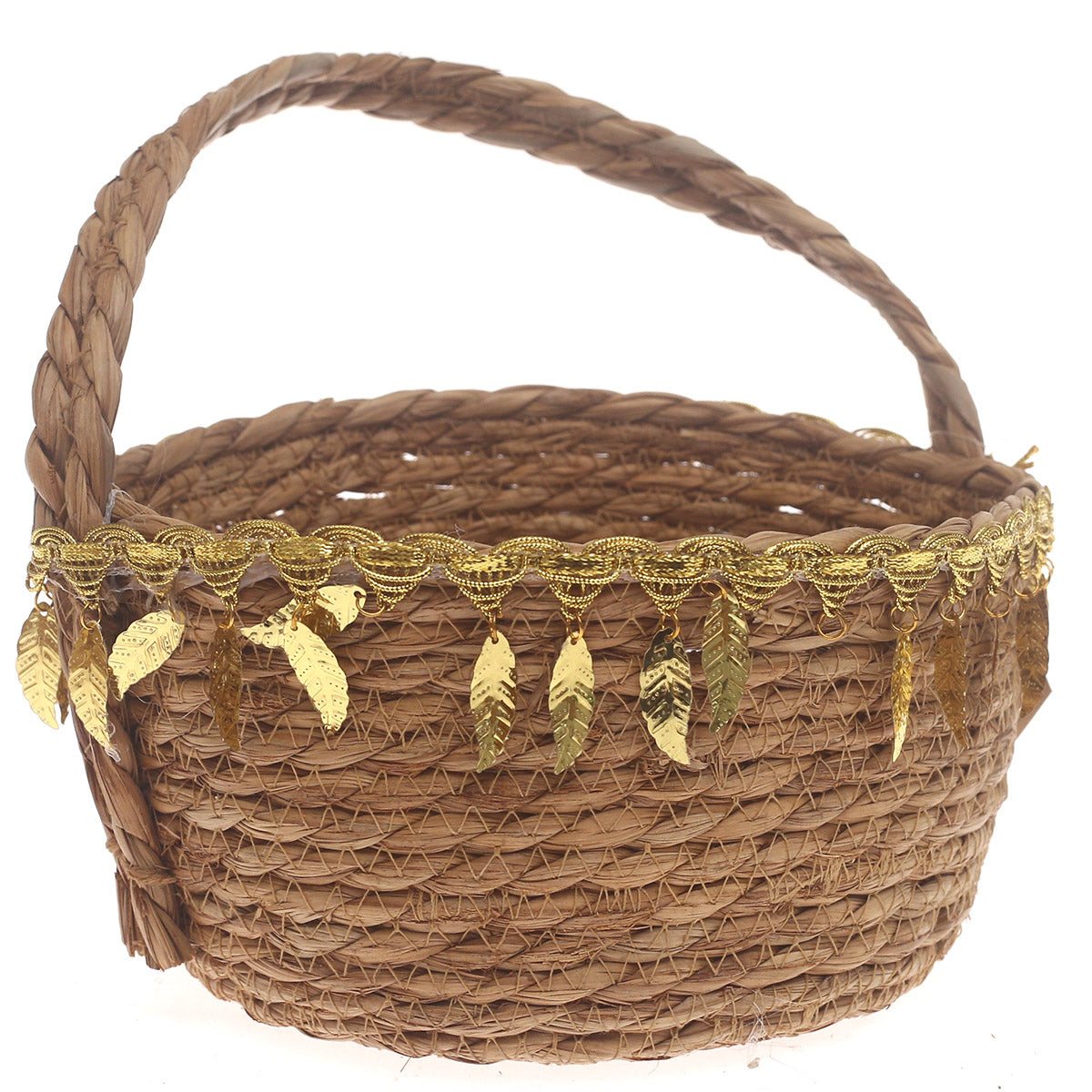 Add a touch of handcrafted elegance to your space with the Large Brown Handwoven Storage Basket, thoughtfully designed to combine natural charm with decorative detailing. Made from tightly woven natural fibers, this basket features a sturdy arched handle and delicate gold leaf embellishments along the rim, creating a warm, festive look. Perfect for storage or display, it enhances interiors with a rustic yet refined aesthetic.