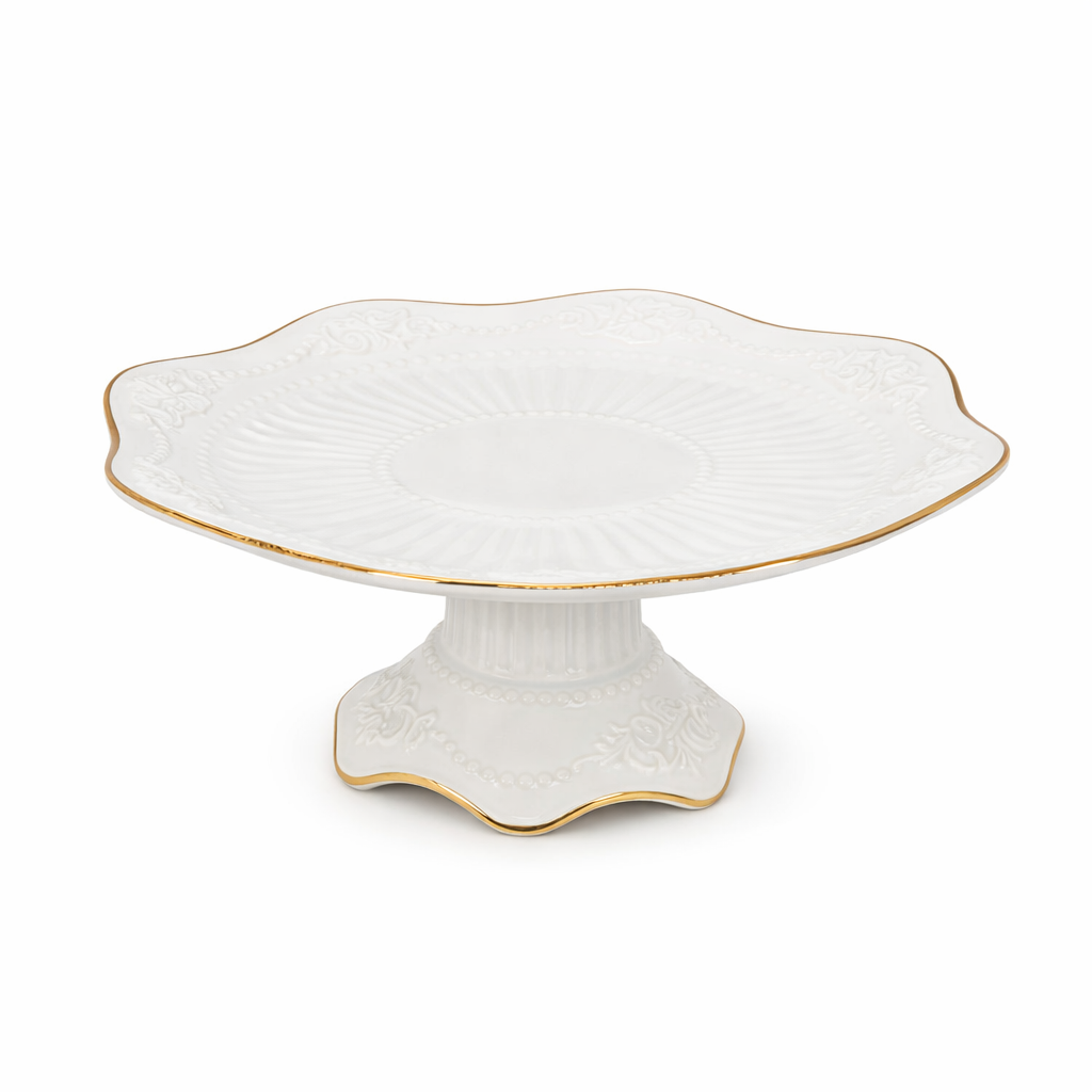 The Large Fruit Dish is a luxurious porcelain serving piece designed to create an impressive table presentation. Finished in classic white with refined embossed detailing and accented by a delicate gold-trimmed rim, this pedestal dish exudes timeless elegance. Its spacious surface and elevated base make it ideal for beautifully displaying fruits, desserts, pastries, or appetizers during gatherings, celebrations, and formal dining occasions.