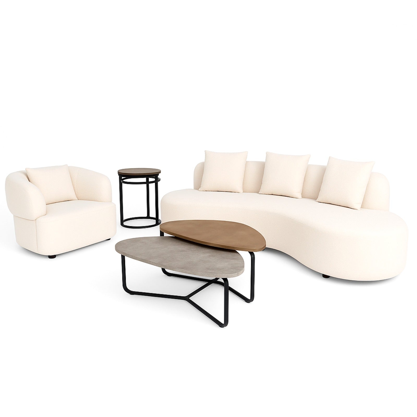 Crafted with a durable wooden frame, upholstered in premium soft-touch fabric, and finished with high-density cushions, this set provides ample seating and a distinctive shape that enhances the flow of any room.