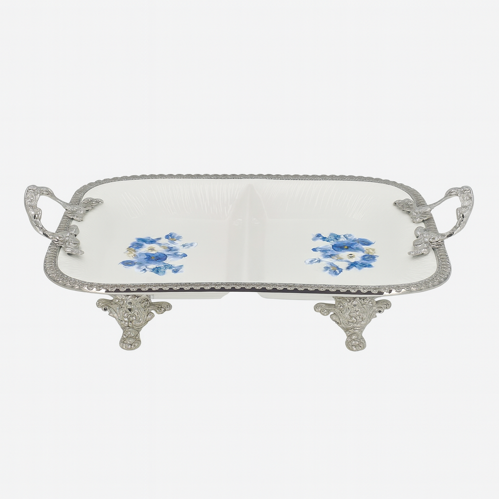 Serve with elegance using this Luxury 2-Section Serving Dish – Blue Floral Design (Small), crafted to bring classic charm and refined presentation to your table. Featuring a soft ivory ceramic base adorned with delicate blue floral motifs, this dish is framed with ornate silver-toned detailing and elevated on decorative legs for a regal finish. The two divided sections make it ideal for serving snacks, sweets, dry fruits, or condiments while keeping items neatly separated. Perfect for everyday dining, festive spreads, or formal hosting, this piece also works beautifully as a decorative table accent.
