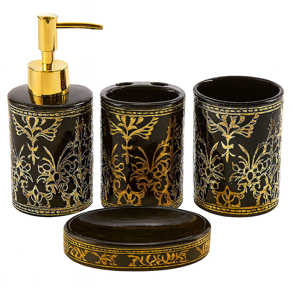 Redefine elegance in your bathroom with this 4-Piece Luxury Ceramic Bathroom Accessory Set, available in both silver and golden finishes. The sleek black base paired with intricate metallic floral patterns exudes timeless sophistication, making it a perfect blend of modern glamour and classic charm. Whether placed in a contemporary ensuite or a guest bathroom, this set enhances your space with refined style and function.