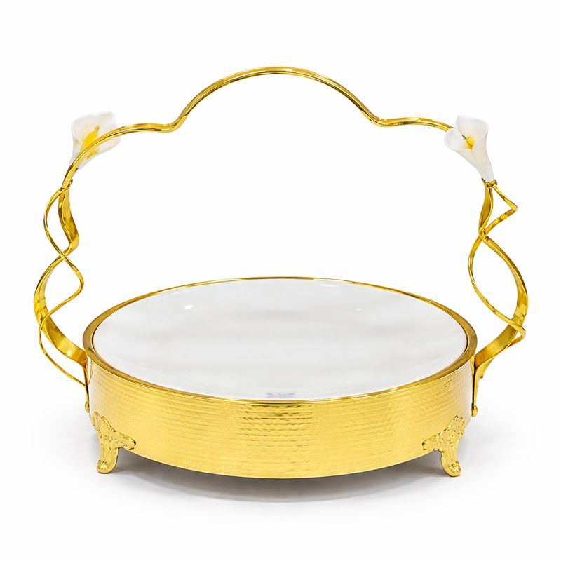 Elevate your décor with this luxurious gold decorative dish, designed to add refined elegance and timeless charm to any space. Featuring a smooth white serving surface set within a beautifully textured gold base, this piece is accented with an artistic arched handle adorned with delicate floral details. Whether styled as a centerpiece or used for serving, it brings sophistication to coffee tables, dining settings, consoles, and festive arrangements. Available in small, medium, and large sizes, it offers versatile styling options for every setting.
