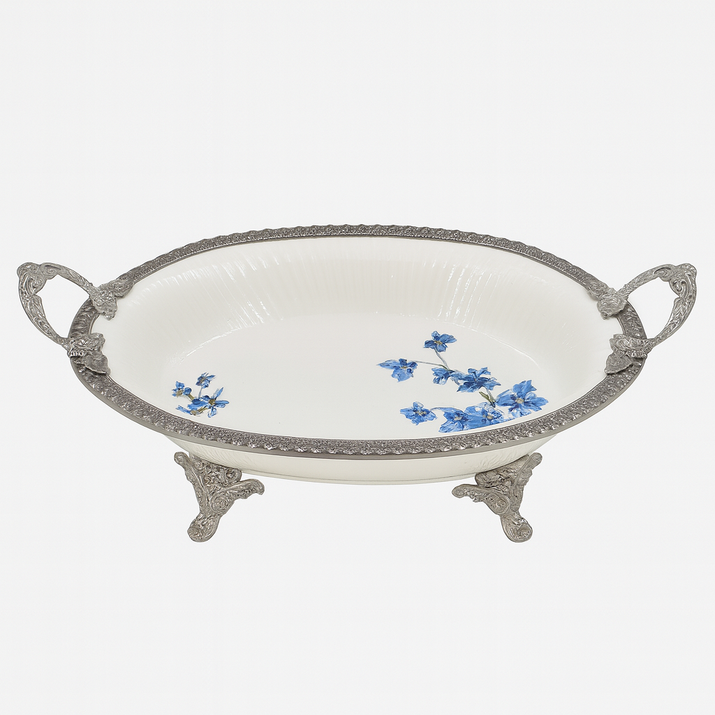 Present your dishes with understated elegance using this Luxury Oval Serving Dish – Blue Floral Design. Featuring delicate blue floral artwork on a soft ivory ceramic base, this dish is beautifully framed with ornate silver-toned edging and elevated on decorative legs for a regal finish. Its smooth oval shape makes it ideal for serving snacks, appetizers, sweets, dry fruits, or festive treats, while also serving as a tasteful décor accent for dining tables and console displays.