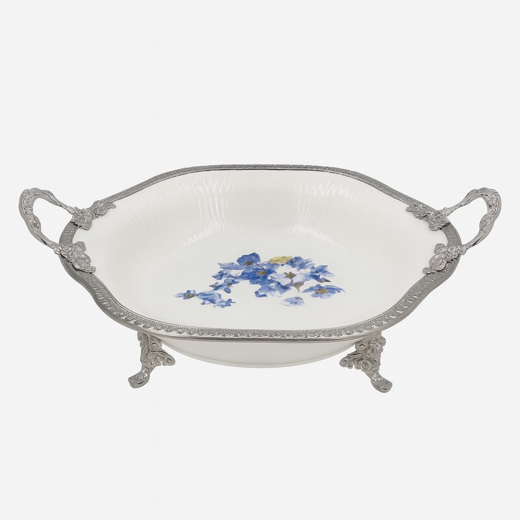 Add timeless charm to your table with this Luxury Serving Dish – Blue Floral Design (Small). Featuring a graceful deep-bowl silhouette, this elegant dish is adorned with delicate blue floral artwork set on a soft ivory ceramic base. The ornate silver-toned rim, classic side handles, and decorative raised legs give it a regal, vintage-inspired appeal. Perfect for serving snacks, fruits, sweets, salads, or dry items, this dish also works beautifully as a statement décor piece for dining tables, consoles, or festive setups.