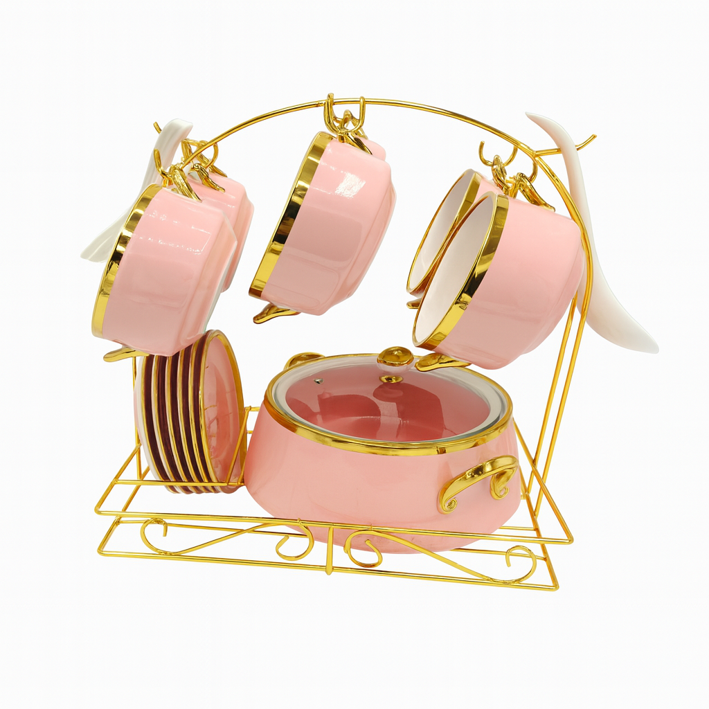 Enhance your dining table with this Luxury 22-Piece Soup Set with Stand, now available in elegant White, Black, Pink, and Green color variants. Designed to combine refined aesthetics with everyday functionality, this premium soup set features a spacious soup tureen, matching bowls with lids, and coordinated saucers, all neatly arranged on a decorative metal stand. Finished with luxurious gold accents, the set adds a sophisticated and modern touch to formal dinners, festive occasions, and stylish home dining.