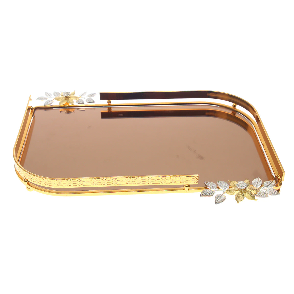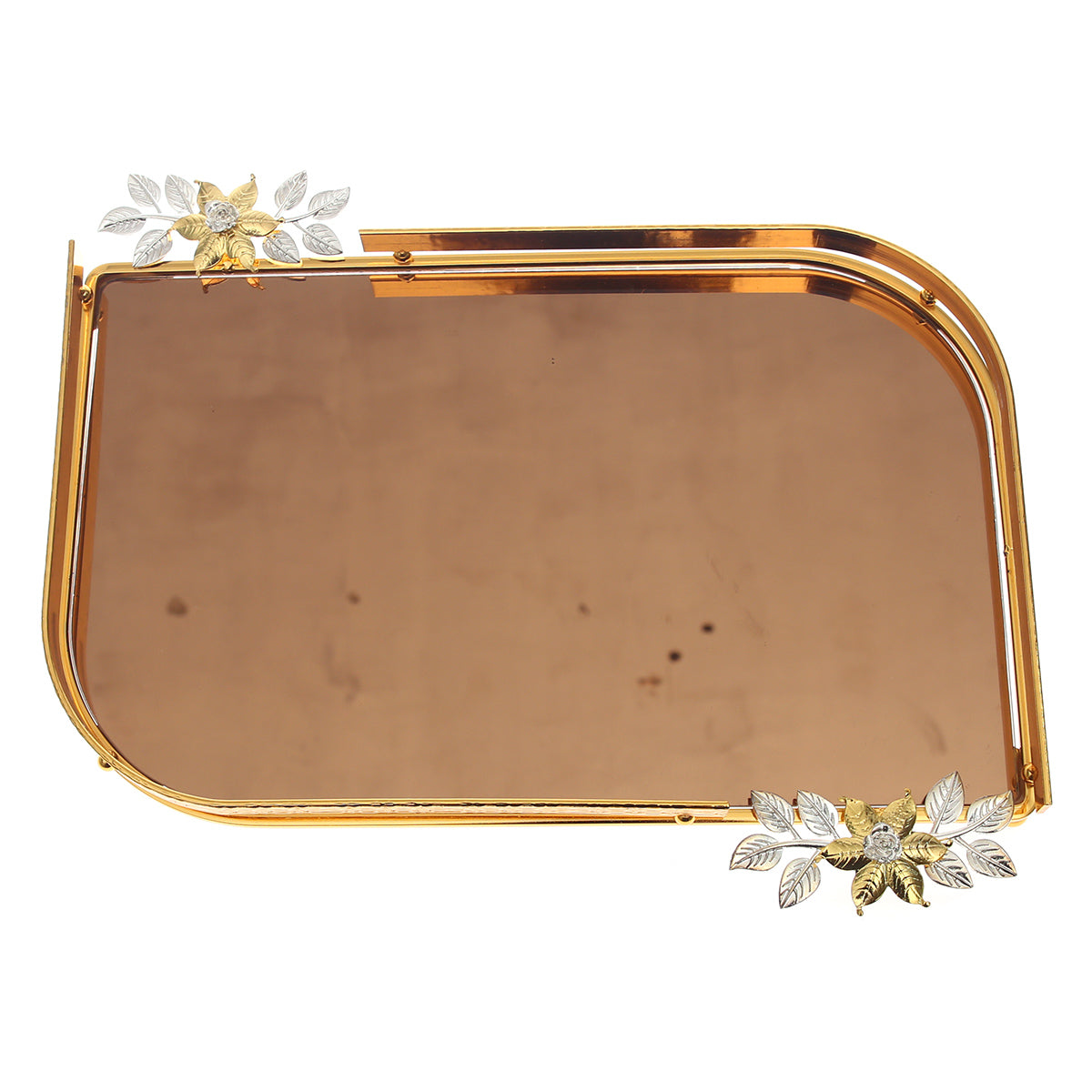 Bring elegance and sophistication to your space with this Luxury Vanity Dish (Model 131-2). Designed with a gold-plated metal frame and a mirror-finish base, this rectangular tray features exquisite floral embellishments on both corners, blending modern design with timeless luxury.