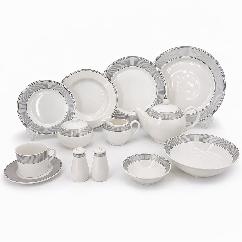 Bring modern elegance to your dining table with this Luxury White & Grey Border 47-Piece Dinner Set, designed for refined everyday dining and stylish entertaining. Featuring a clean white base accented with a sophisticated grey striped border, this tableware set offers a perfect balance of contemporary design and timeless appeal. The coordinated patterns across plates, bowls, cups, and serving pieces create a cohesive and polished table setting, ideal for family meals, formal dinners, and festive occasions. This premium dinner set enhances presentation while delivering lasting functionality.