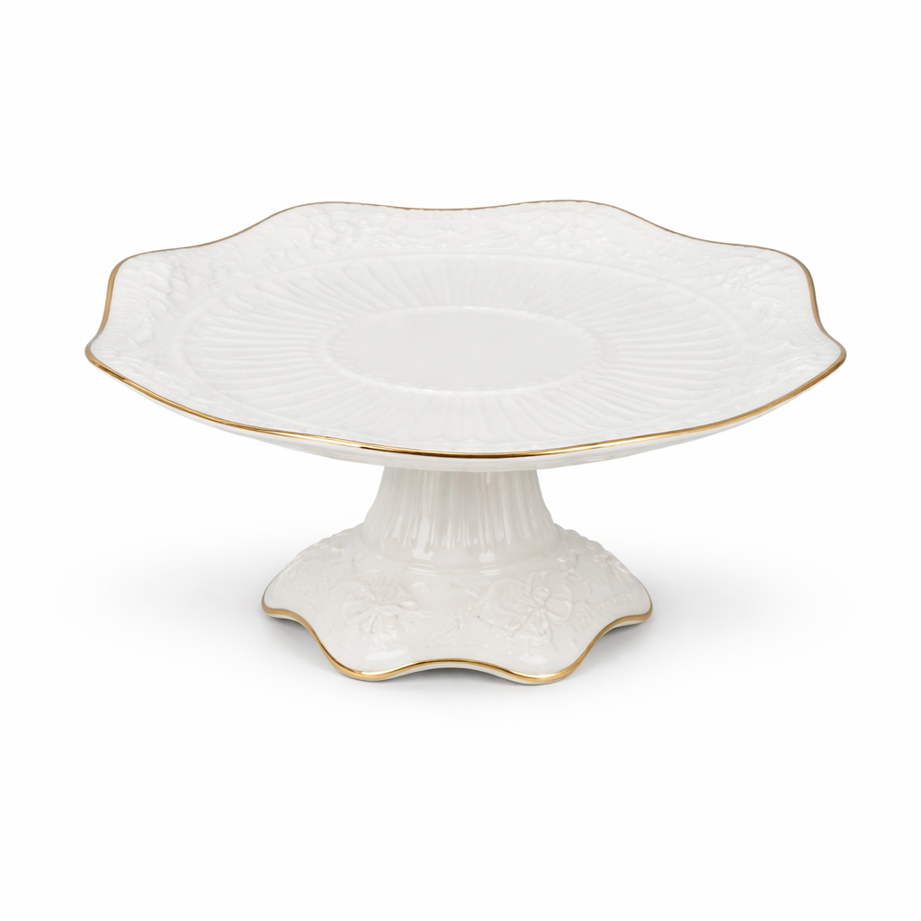 The Medium Fruit Dish is a sophisticated porcelain serving piece crafted to enhance refined table presentations. Designed in a classic white finish with elegant embossed detailing and finished with a delicate gold-trimmed edge, this pedestal dish offers a graceful balance of style and functionality. Its slightly lower profile compared to traditional bowls makes it ideal for beautifully presenting fruits, pastries, desserts, or savory snacks.
