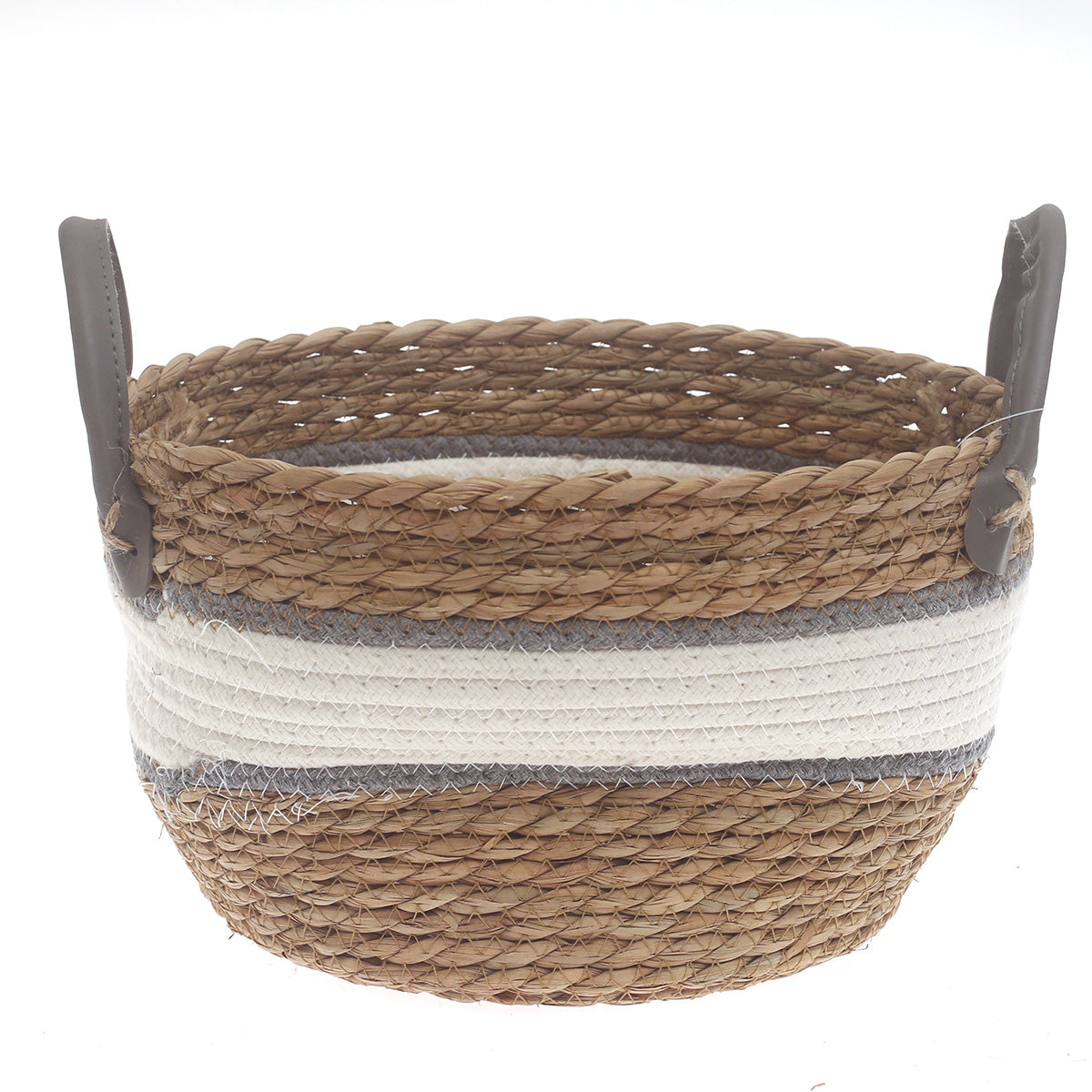 Add soft texture and effortless organization to your home with this medium woven storage basket featuring a calming white and grey stripe design. Handcrafted from durable natural fibers, this basket blends warm earthy tones with subtle grey accents and a clean white band for a refined, modern look. Its compact yet practical size makes it ideal for storing toiletries, accessories, toys, craft supplies, or everyday essentials.
