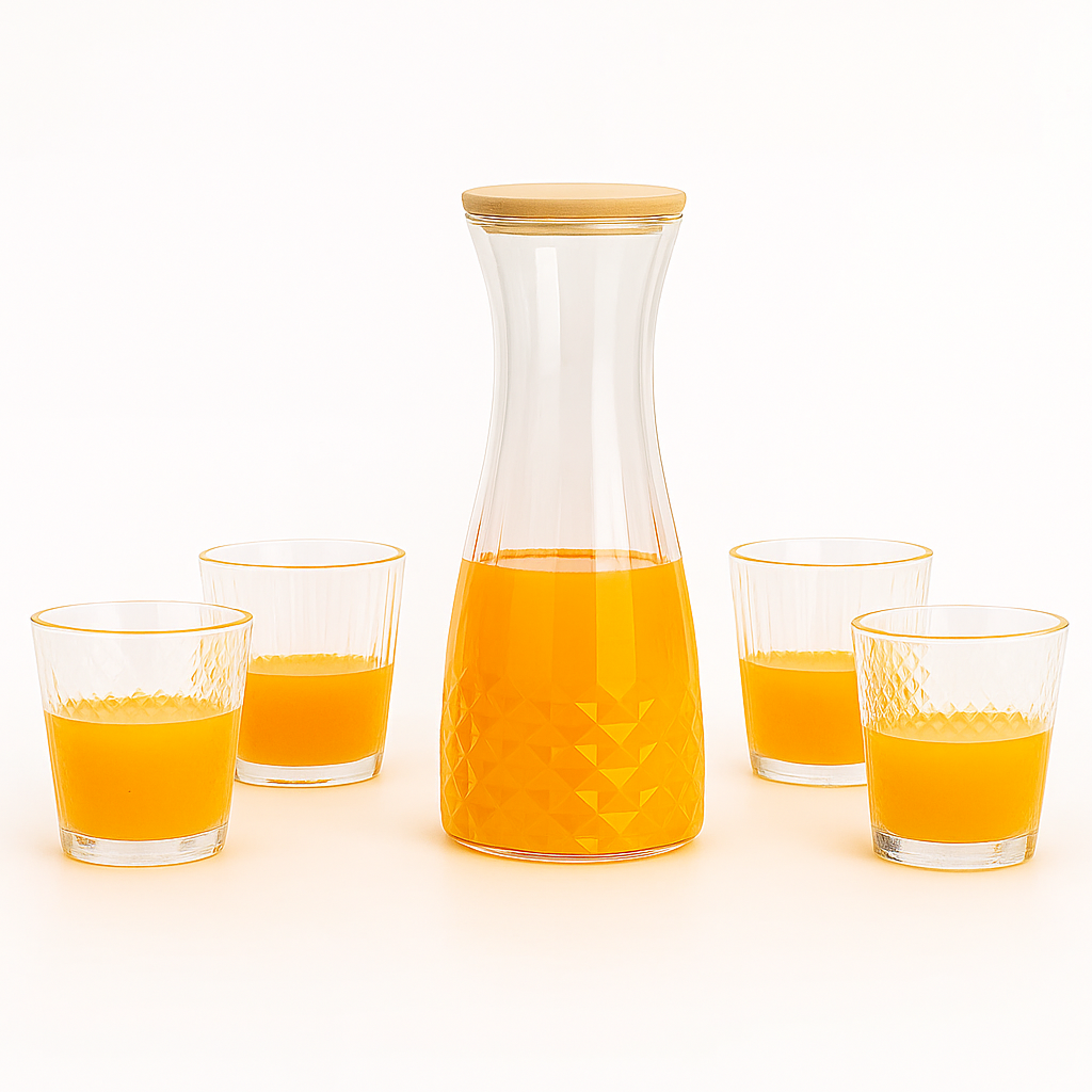 Elegant 7-piece water set featuring a diamond-cut glass jug with bamboo lid and matching glasses. Perfect for serving juices or water with style at home or gatherings. Durable, clear glass with a premium textured finish.