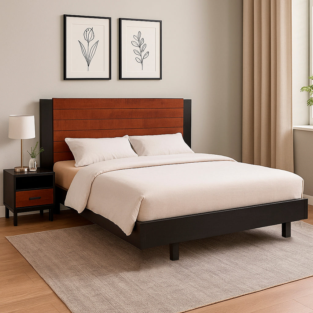The Morris King Size Bed brings understated elegance to your bedroom with its layered laminated finish in warm brown and deep black tones. Designed with a strong wooden core for reliable support, it offers lasting comfort while remaining budget-friendly. Its timeless look complements a wide range of interiors, making it a smart and stylish addition to any modern home.