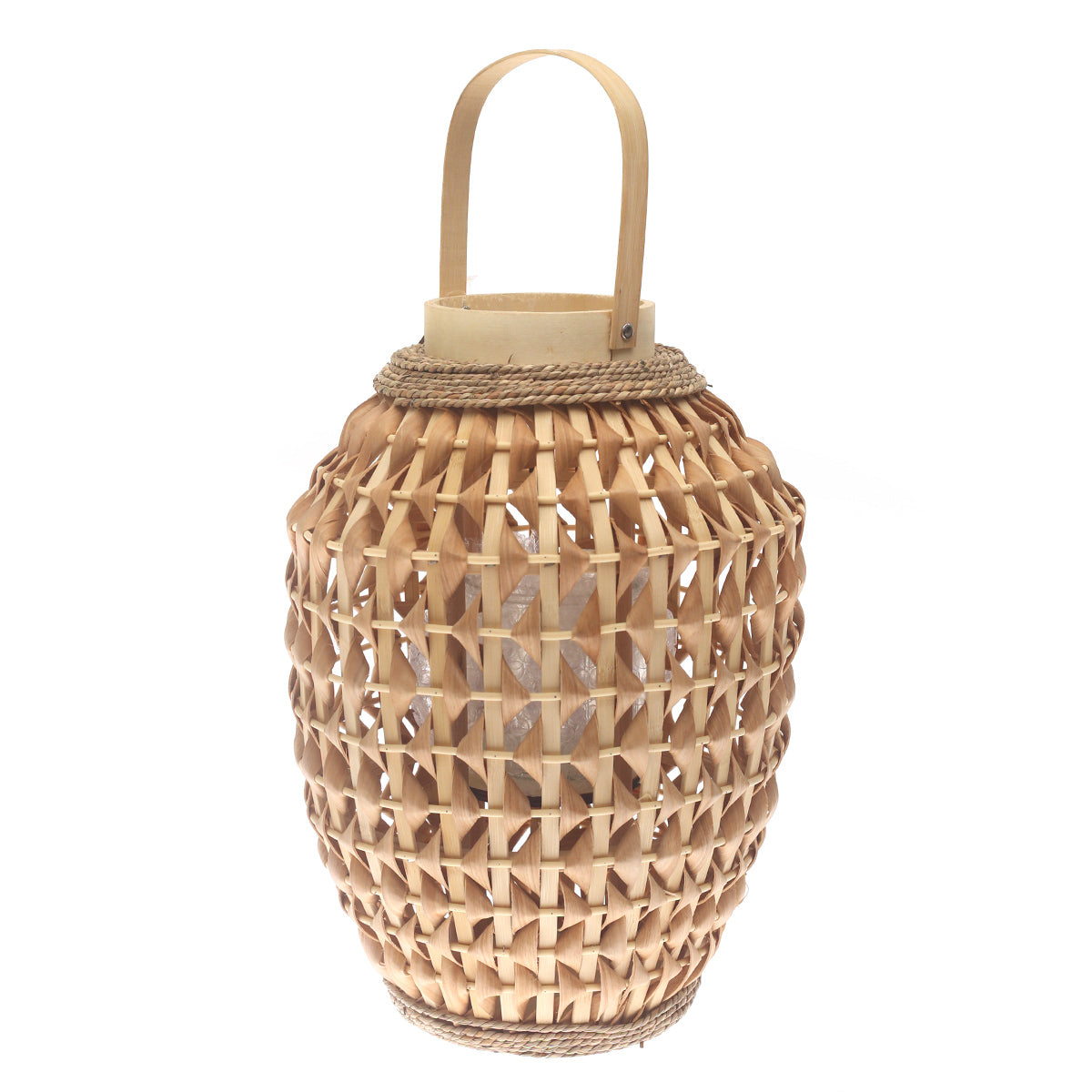 Add a warm, organic touch to your décor with this Natural Hanging Lantern, beautifully handcrafted to bring relaxed elegance into any space. Featuring an intricate handwoven bamboo design in a natural finish, this lantern is complemented by a sturdy bamboo handle and a clear glass candle holder inside. Standing 17 inches tall, it creates a striking visual while casting a soft, ambient glow—perfect for enhancing living rooms, balconies, patios, entryways, or festive settings. Its earthy texture and timeless design make it a versatile décor accent for both modern and bohemian interiors.