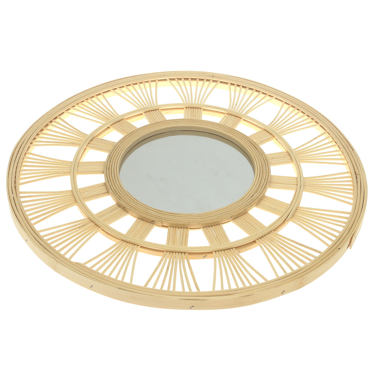 Introduce timeless natural elegance to your space with this Natural Round Mirror, beautifully framed with a handcrafted bamboo weave. The refined radial pattern creates a balanced, sun-inspired design that adds lightness, depth, and visual interest to your walls. With its generous 18 x 18 inch size, this mirror serves as a striking statement piece while remaining versatile enough to complement bohemian, coastal, modern, or earthy interiors. Perfect for living rooms, bedrooms, entryways, or styled gallery walls.