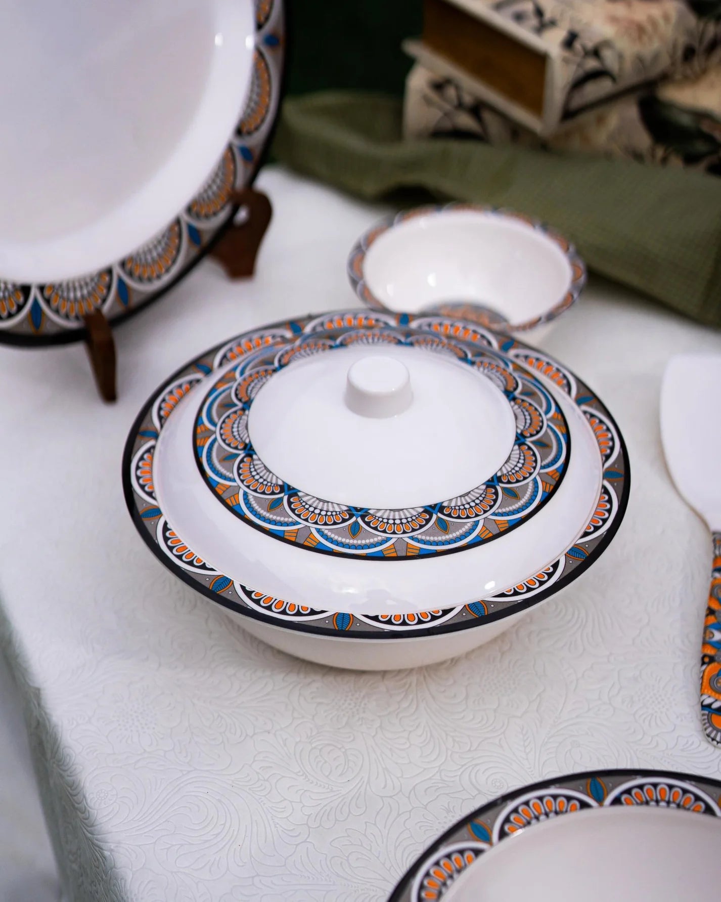 Turn every meal into a visual celebration with the Nightfall Blossom Dinner Set, a stunning blend of artistic mandala patterns and rich, warm hues set against a crisp white base. Inspired by timeless craftsmanship and modern elegance, this dinnerware collection adds depth, color, and sophistication to your table. Part of our premium melamine series, Nightfall Blossom is designed to impress—whether you’re hosting guests or enjoying everyday family meals.