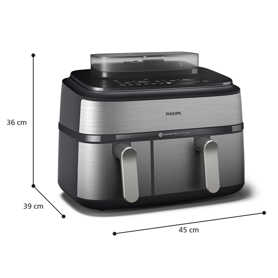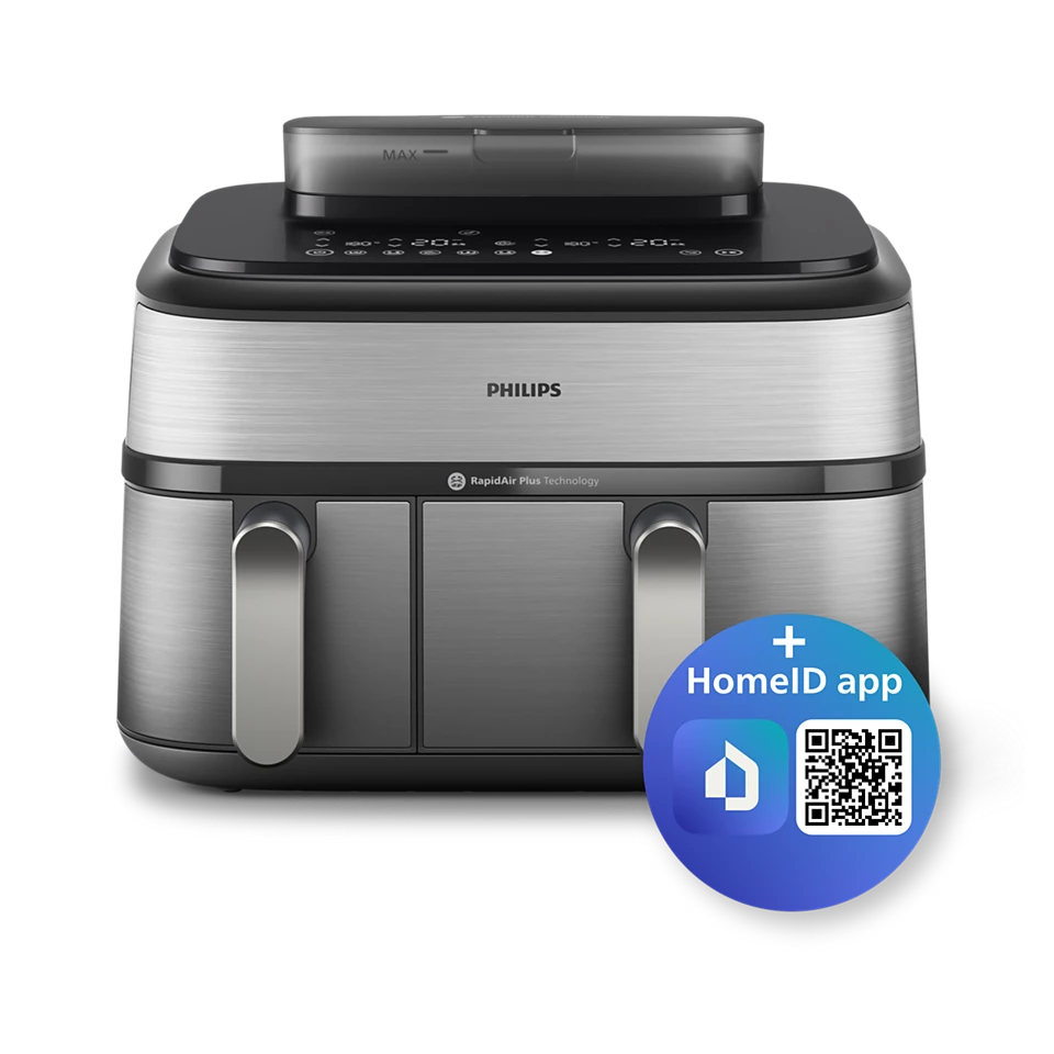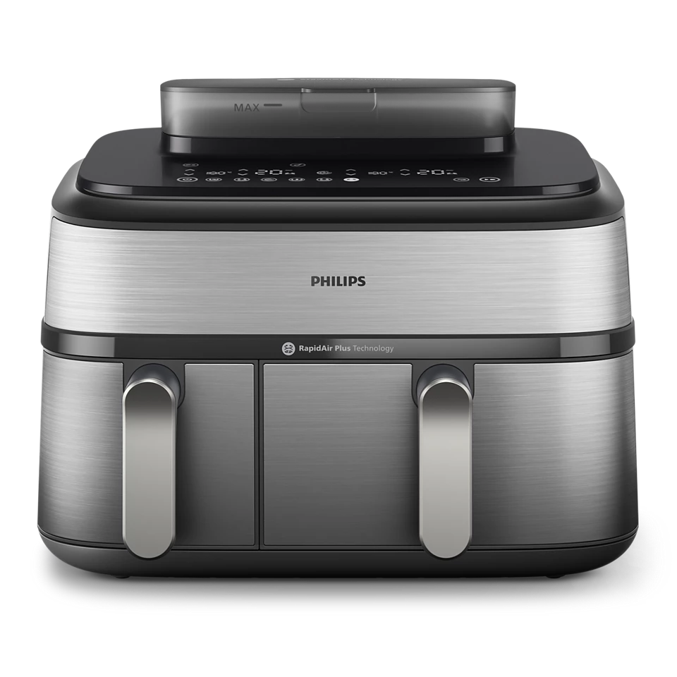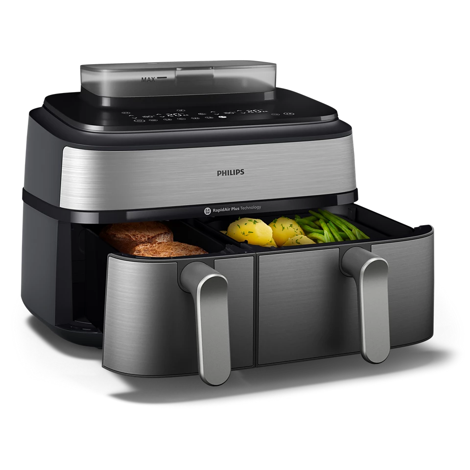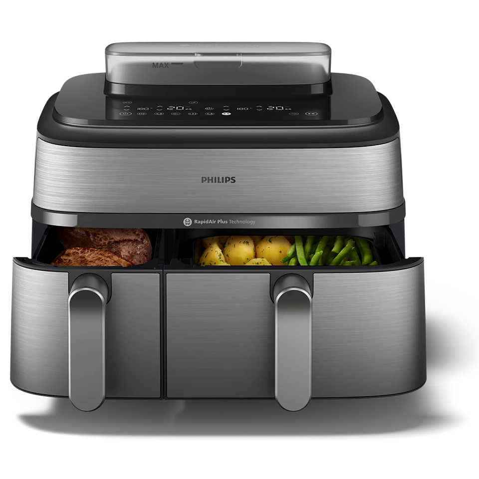 Transform the way you cook with the Philips 5000 Series Dual Basket Airfryer NA555/09, designed for maximum flexibility and healthier everyday meals. Featuring dual independent baskets, this advanced airfryer lets you cook two different dishes at the same time—each with its own time and temperature—so everything finishes together, perfectly cooked and ready to serve.