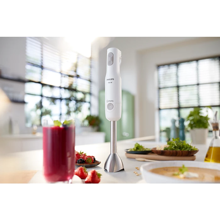 The Philips ProMix Hand Blender HR2545/01 is a powerful and versatile kitchen companion designed to simplify everyday food preparation. Equipped with a robust 700W motor and advanced ProMix technology, it ensures fast, smooth, and consistent blending with reduced splashing. The ergonomic design offers comfortable handling, while two speed settings including a turbo function give you full control over different textures. Supplied with an XL chopper, whisk, and beaker, this hand blender is perfect for preparing soups, smoothies, sauces, purees, dips, and whipped ingredients with ease. Its sleek white finish adds a clean, modern look to any kitchen.