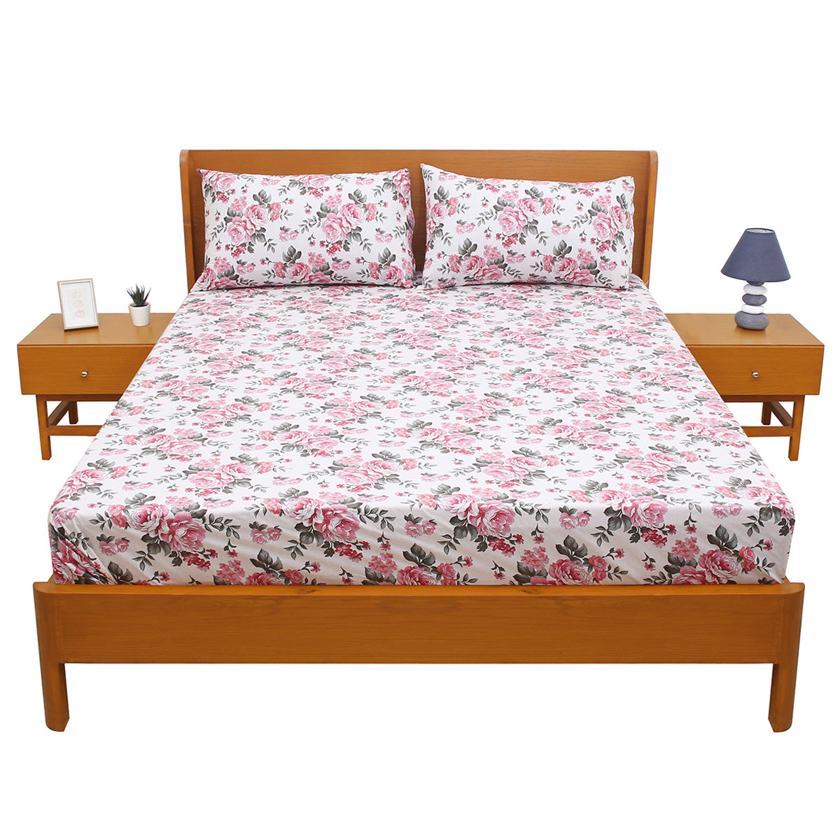 Add a refreshing touch of elegance to your bedroom with this Pink Floral Double Bed Sheet (Design E). Featuring a soft white background beautifully adorned with blooming pink flowers and green leaves, this design brings a soothing and romantic charm to your space. Made from smooth, breathable fabric, it ensures comfort and durability, making it perfect for everyday use or as a charming addition to your guest room.