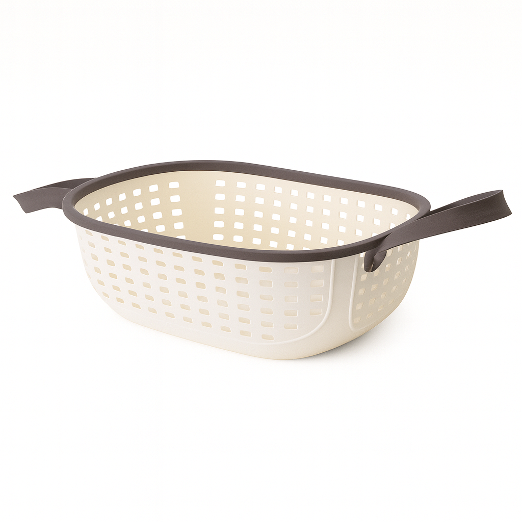 Plastic Basket with Leather Handles (Medium & Small) for Stylish Storage & Easy Carrying This plastic basket with elegant leather-style handles offers a perfect blend of strength, convenience, and modern design. Ideal for organizing fruits, vegetables, snacks, toiletries, or household essentials, it features a ventilated body for airflow and sturdy side handles for comfortable carrying. Available in medium and small sizes, it’s a versatile organizer for both kitchen and home use.