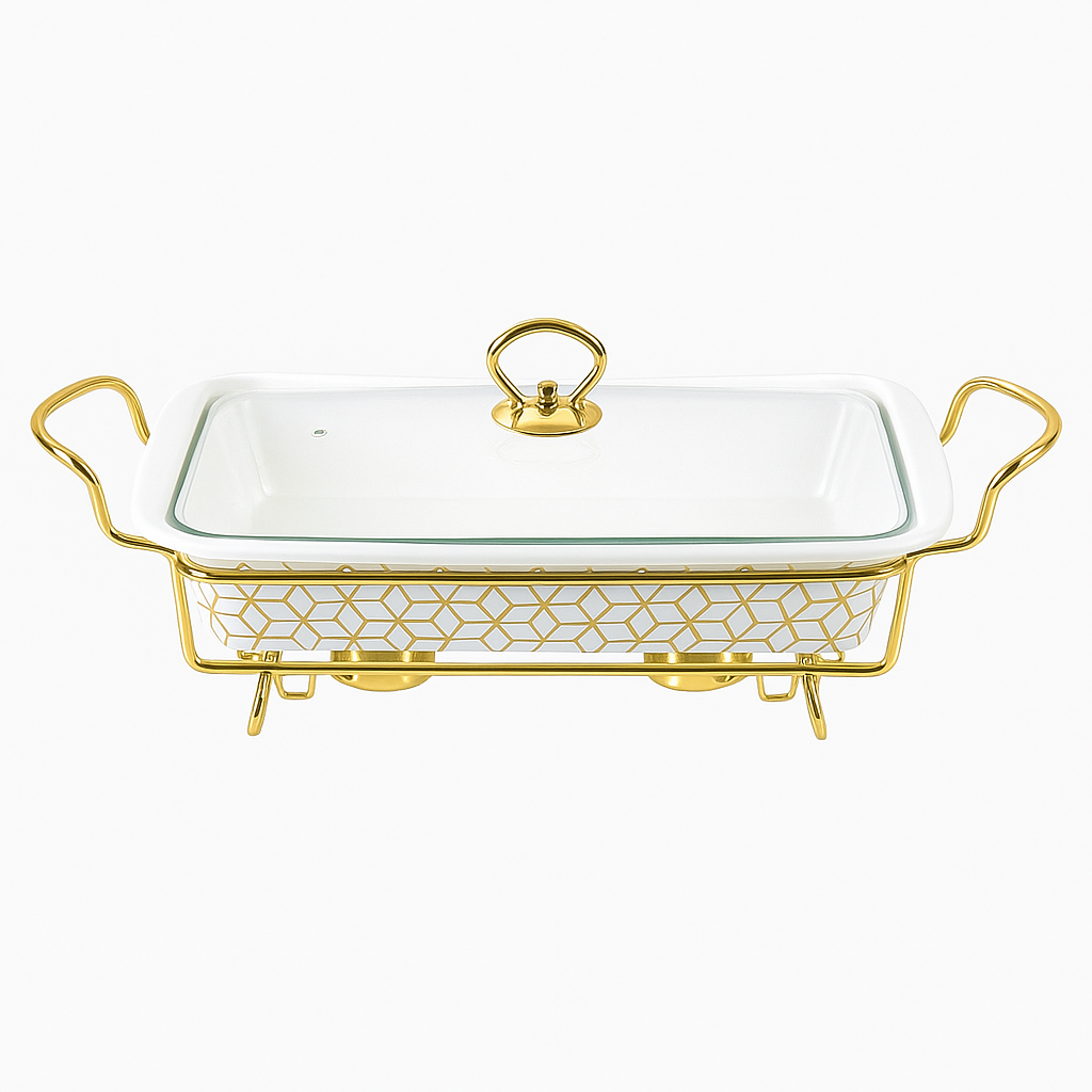 Premium 13" Ceramic Casserole With Gold Metal Stand – Elegant Serving & Warming Dish