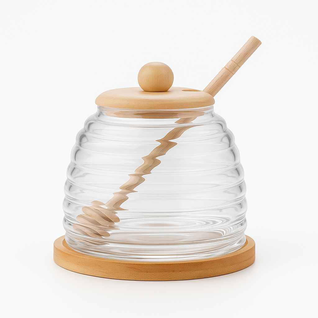 Premium Glass Honey Jar with Wooden Lid & Dipper for Easy, Drip-Free Serving This elegant 500ml glass honey jar combines a beehive-inspired design with a natural wooden lid and dipper, offering a clean, stylish, and practical way to store and serve honey. Its crystal-clear glass enhances kitchen décor while making the contents easy to see, ensuring both beauty and convenience.