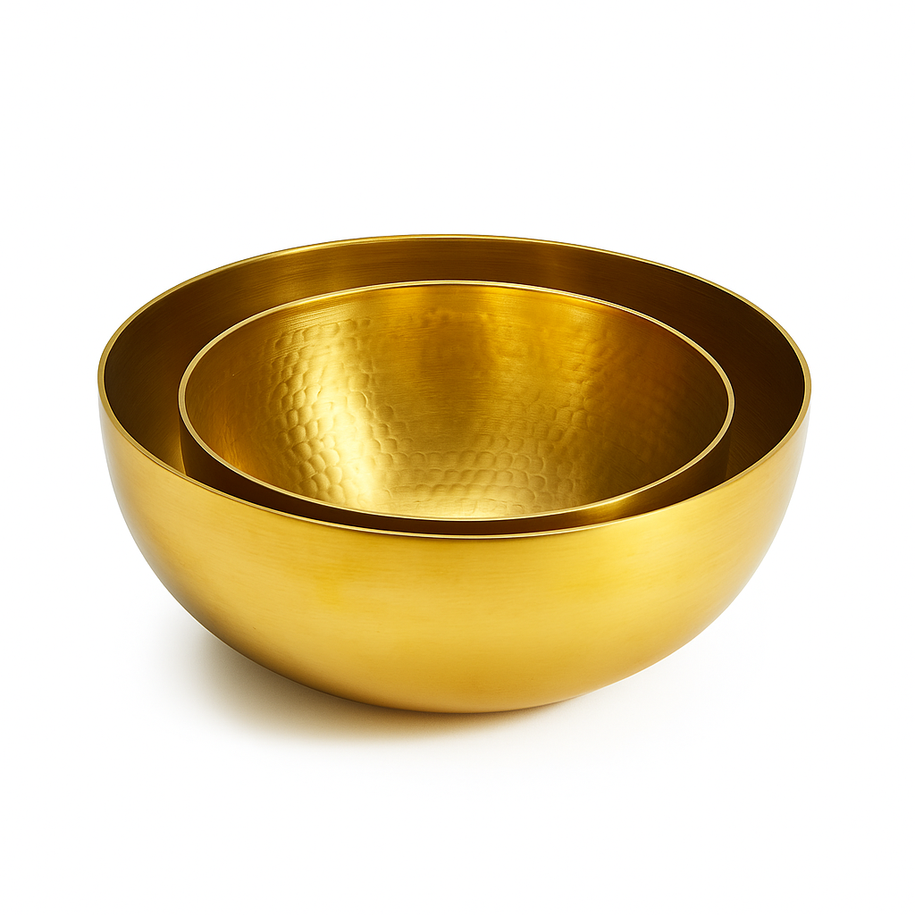 Add a touch of luxury to your kitchen with this Premium Golden Mixing Bowl, featuring two beautifully crafted bowls in 22 cm and 25 cm sizes. Designed for both style and functionality, these bowls showcase a stunning brushed and lightly hammered golden finish that reflects sophistication in every use. Perfect for mixing, serving, or displaying, this set combines durability with timeless design — an ideal choice for modern and elegant kitchens.