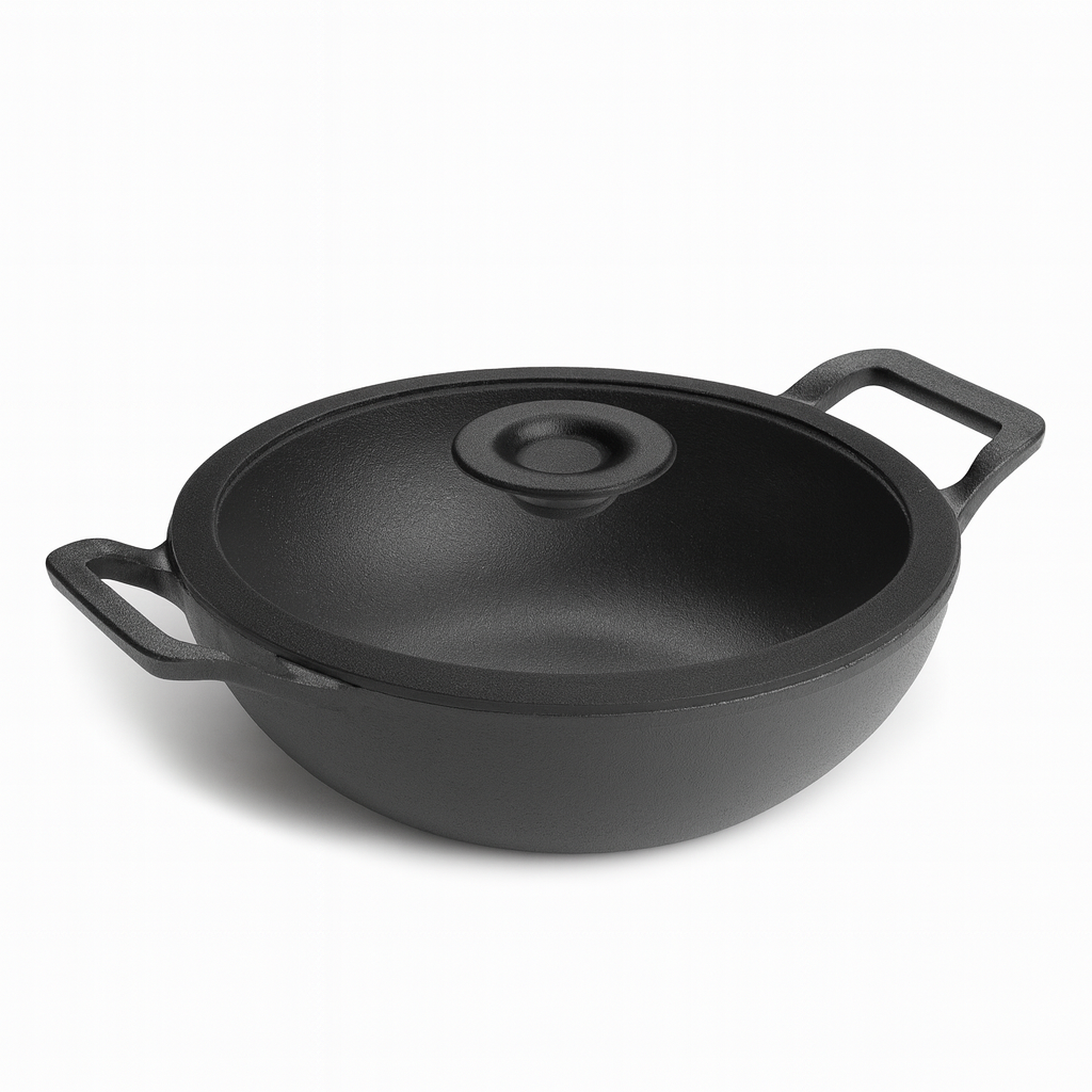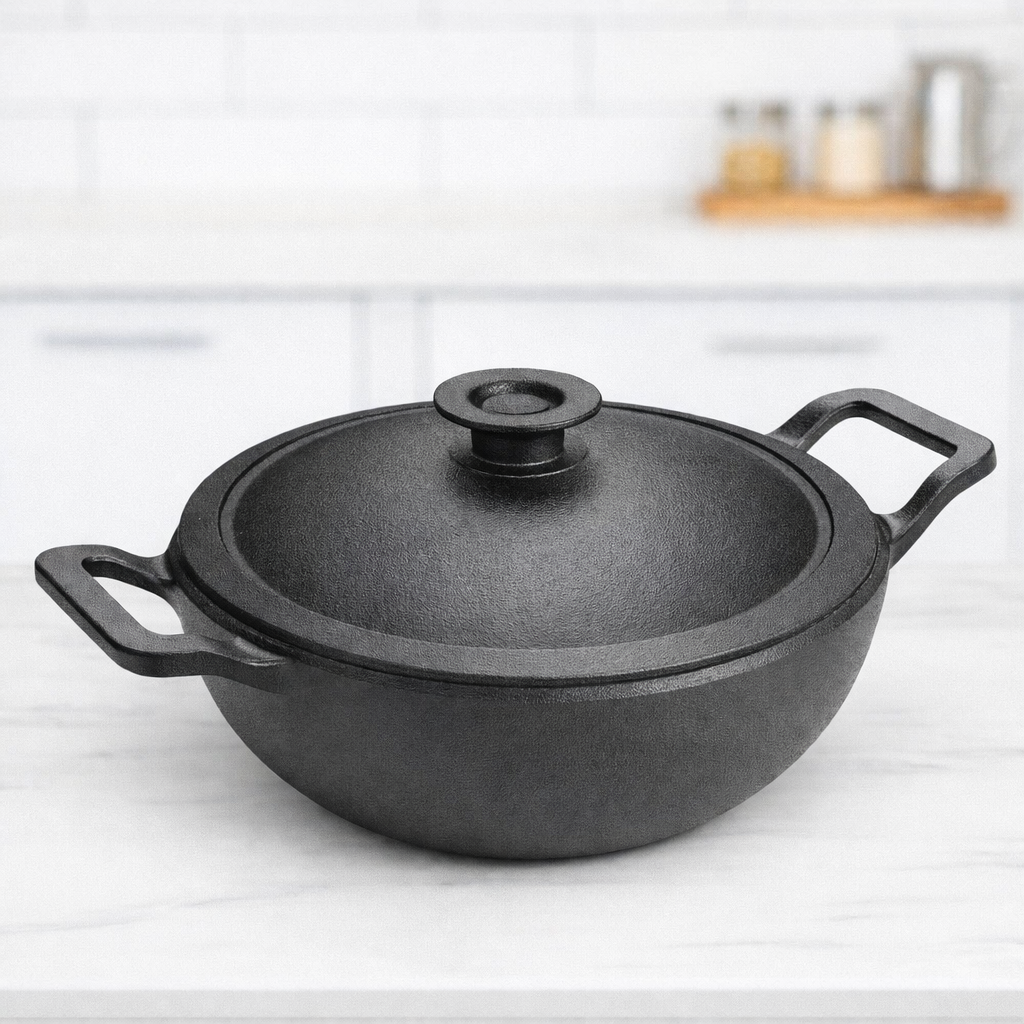 Prestige Cast Iron Deep Karahi with Glass Lid 20 cm a compact, heavy-duty cast iron deep karahi designed for superior heat retention and authentic cooking results. Ideal for frying, sautéing, simmering gravies, and everyday small-portion cooking. Comes with a durable glass lid for better visibility and moisture control.