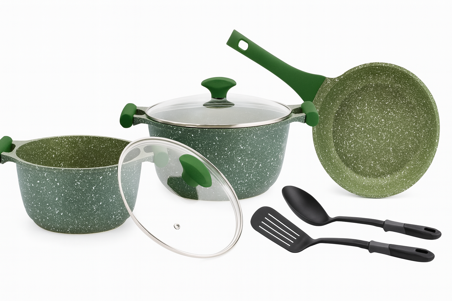 Prestige Essentials 7-Piece Set – Green A versatile 7-piece granite-coated cookware set perfect for daily cooking. Includes pots, a frying pan, matching glass lids, and essential kitchen utensils. Non-stick, durable, and designed with heat-resistant green handles for safe and comfortable use.