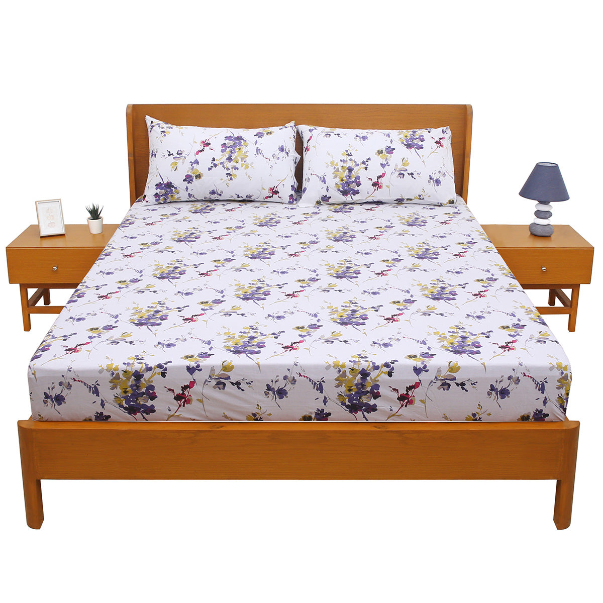 Add a refreshing burst of color to your bedroom with this Purple Floral Double Bed Sheet (Design E). Designed with delicate purple, yellow, and pink flowers on a soft white background, this elegant print brings a serene and cheerful vibe to your space. Made from smooth, breathable fabric, it ensures both comfort and durability, making it perfect for daily use or as a thoughtful gift for your loved ones.