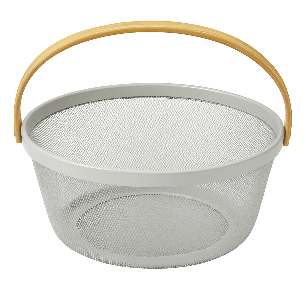 Practical and stylish, this large round metal basket features a fine mesh design with a smooth wooden handle for easy carrying. Ideal for storing fruits, vegetables, bread, or household items, it blends functionality with a clean, modern aesthetic that complements any kitchen or dining décor.