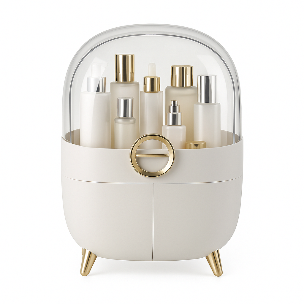 Add elegance to your vanity with this Round Vanity Organizer, perfect for storing skincare, cosmetics, and perfume bottles. Featuring a clear dome lid and a modern circular gold handle, it keeps your essentials dust-free and beautifully displayed.