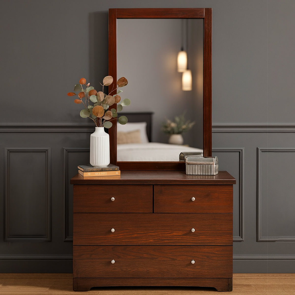 Premium dresser with mirror and drawers for storage covered in brown polish with Oak veneer board.