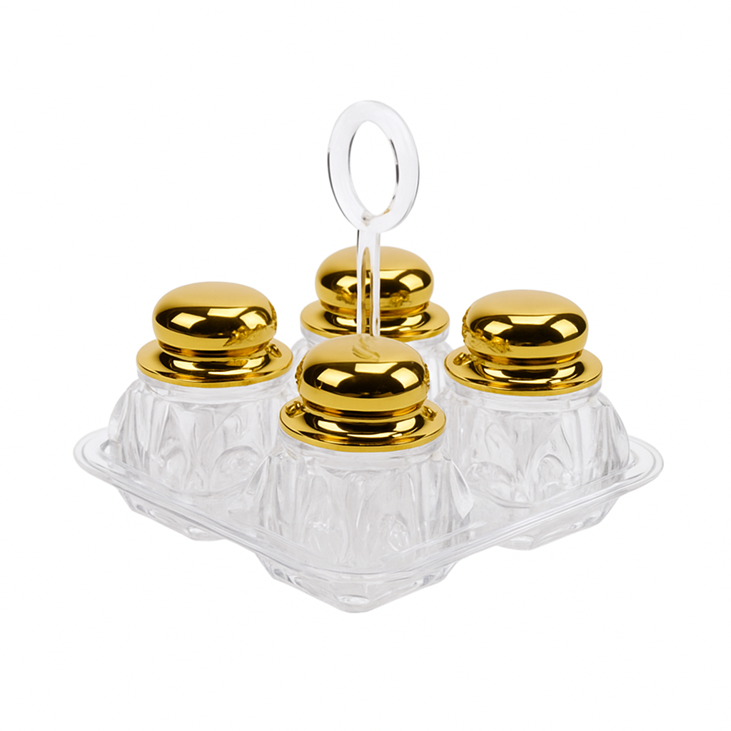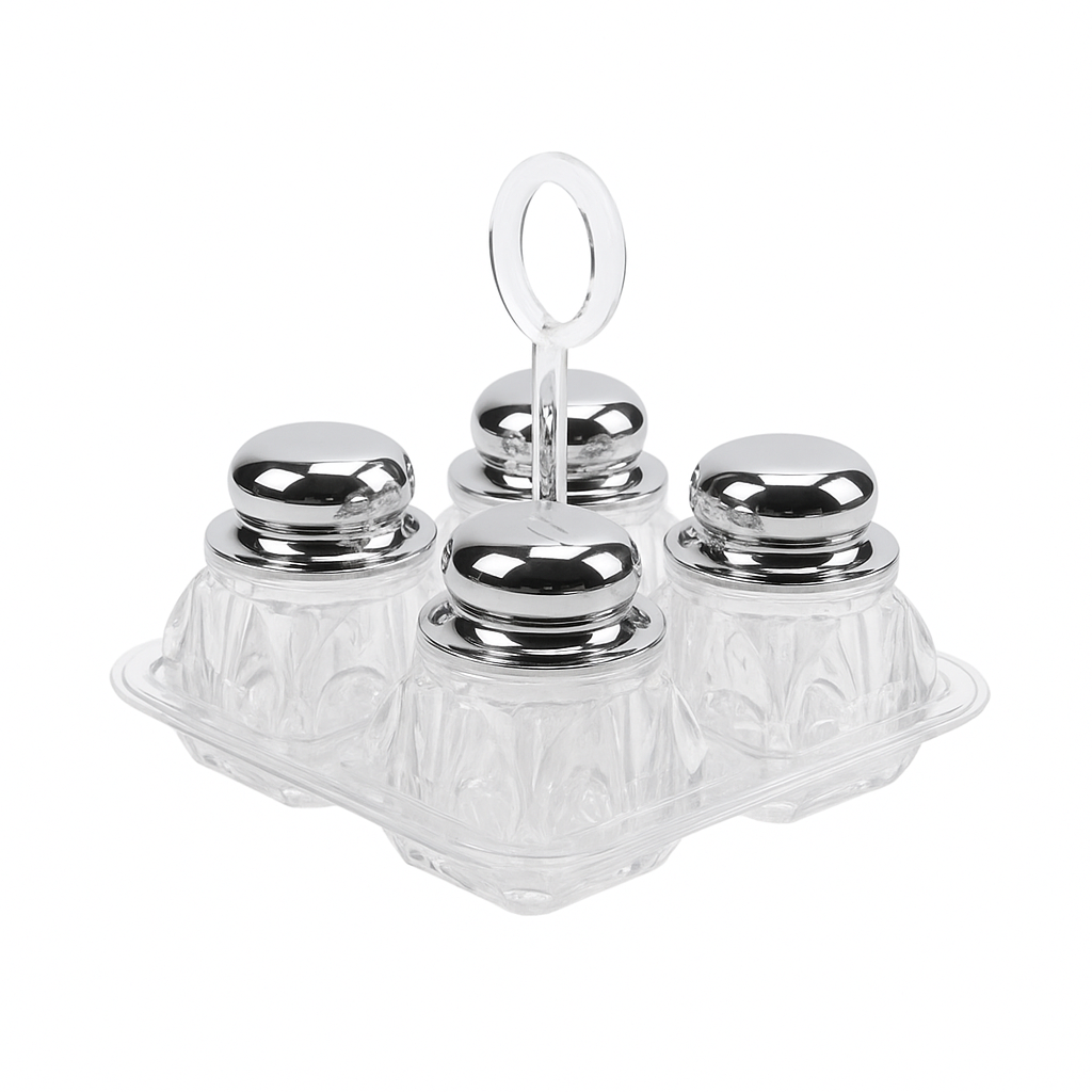 Add elegance and convenience to your dining table with this premium 4-piece Salt & Pepper Cruet Set, available in Rose Gold, Gold, and Silver finishes. Each set includes four acrylic spice jars with metallic-finish lids, neatly arranged in a durable acrylic tray with a central handle for easy portability. Perfect for storing salt, pepper, chili flakes, oregano, and other seasonings, this set is designed for modern kitchens and stylish dining setups.
