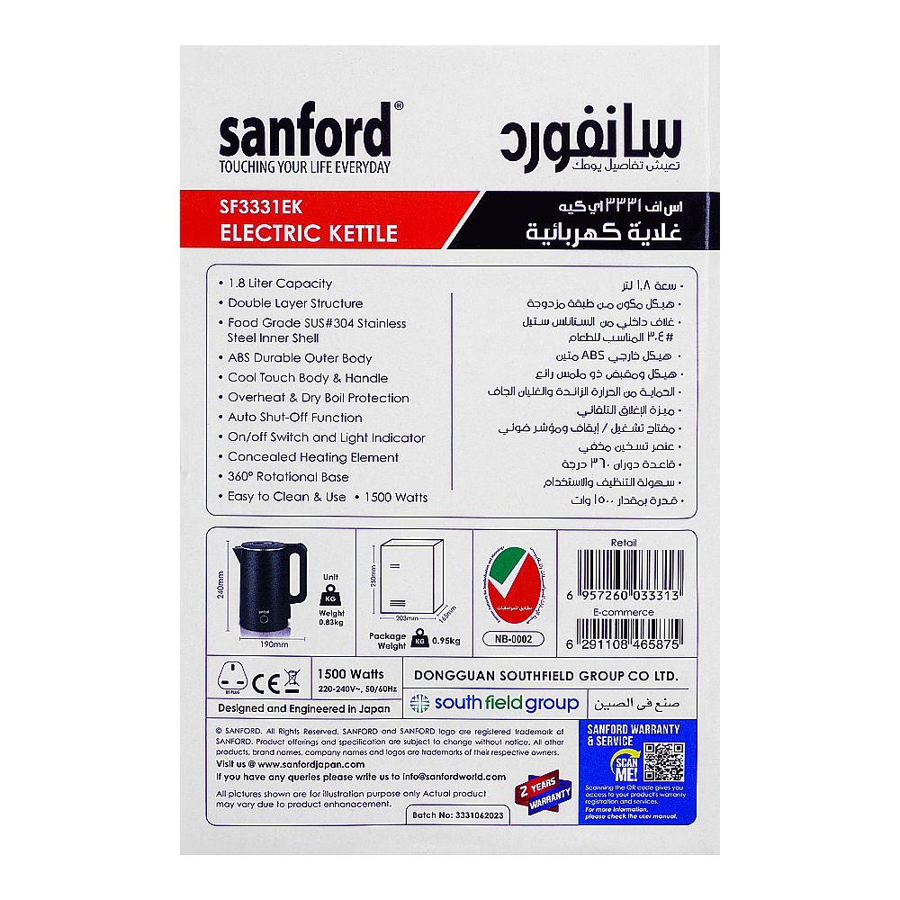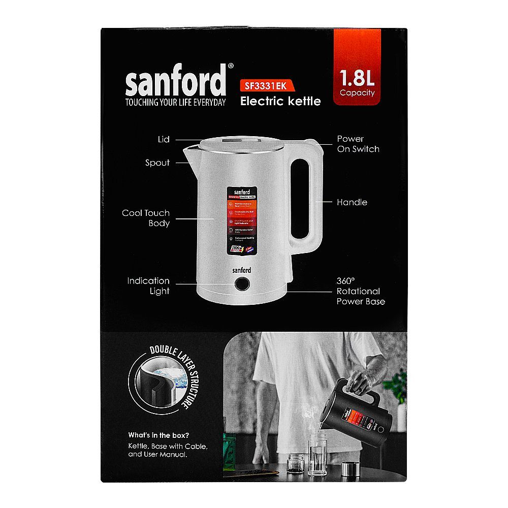 The Sanford Electric Kettle SF-3331EK is a reliable and safe kitchen essential designed for fast boiling and everyday convenience. With a large 1.8-liter capacity, it is perfect for preparing tea, coffee, instant meals, and hot water for cooking. The double-layer structure with a food-grade SUS #304 stainless steel inner shell ensures hygienic boiling, while the durable ABS outer body remains cool to the touch for added safety.