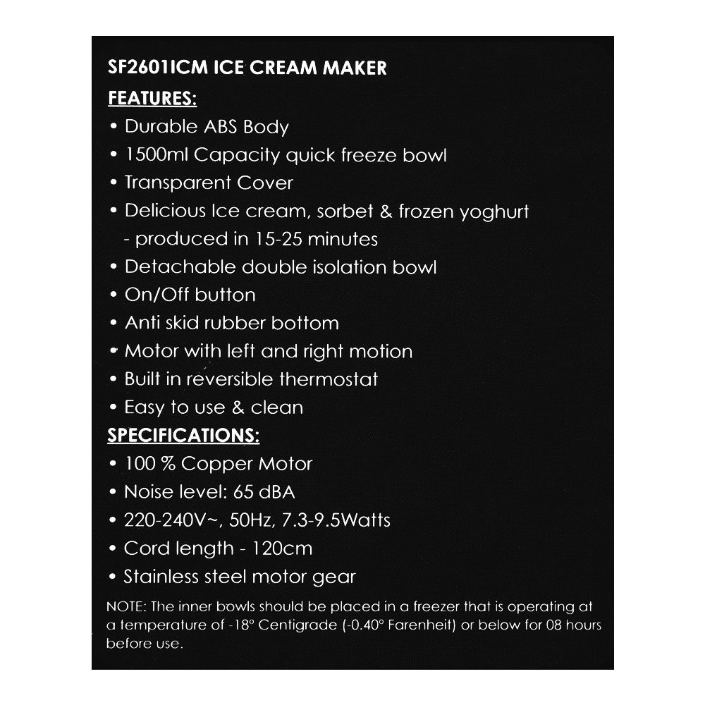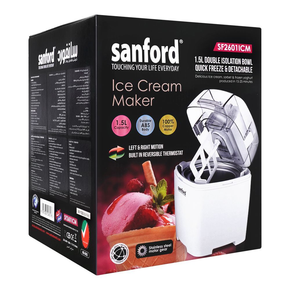 Enjoy rich, creamy homemade desserts with the Sanford Ice Cream Maker SF-2601ICM, designed for quick and effortless preparation of ice cream, sorbet, and frozen yogurt. Featuring a 1.5-liter double isolation quick-freeze bowl, this ice cream maker delivers delicious results in just 15–25 minutes, making it perfect for families and gatherings.