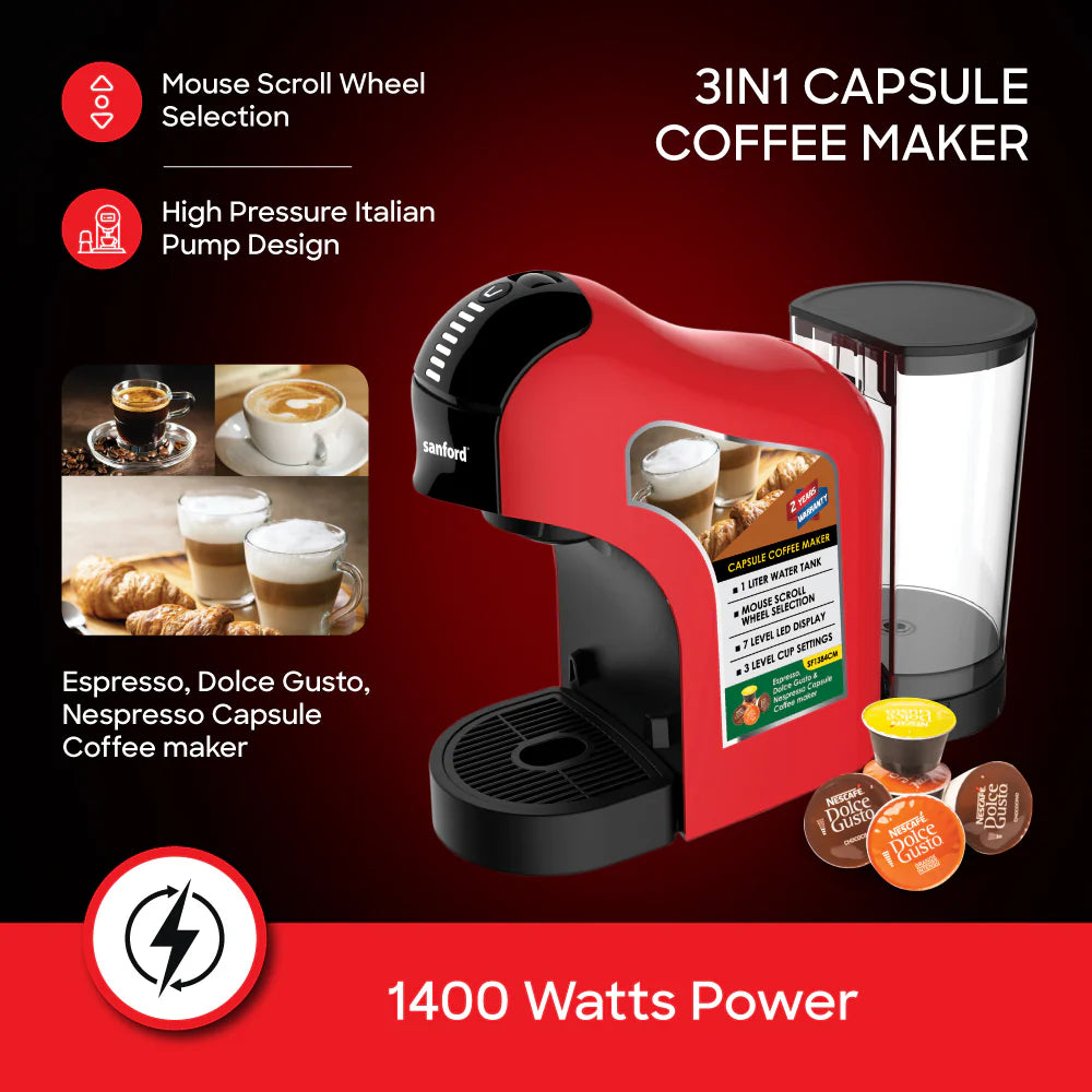 Elevate your home barista game with the SANFORD SF1384CM, a sleek and versatile 3-in-1 capsule coffee maker crafted to deliver café-quality espresso, lungo and milk-based drinks. With its 1400 W high-pressure Italian-style pump, this machine delivers robust flavor and thick crema for every cup. It’s compatible with Nespresso-type, Dolce Gusto-type and espresso-style capsules for maximum convenience. The intuitive mouse-scroll wheel selector and 7-level LED display let you fine-tune brew strength and cup size with ease. A 1-litre transparent water tank keeps you brewing all morning without constant refills.