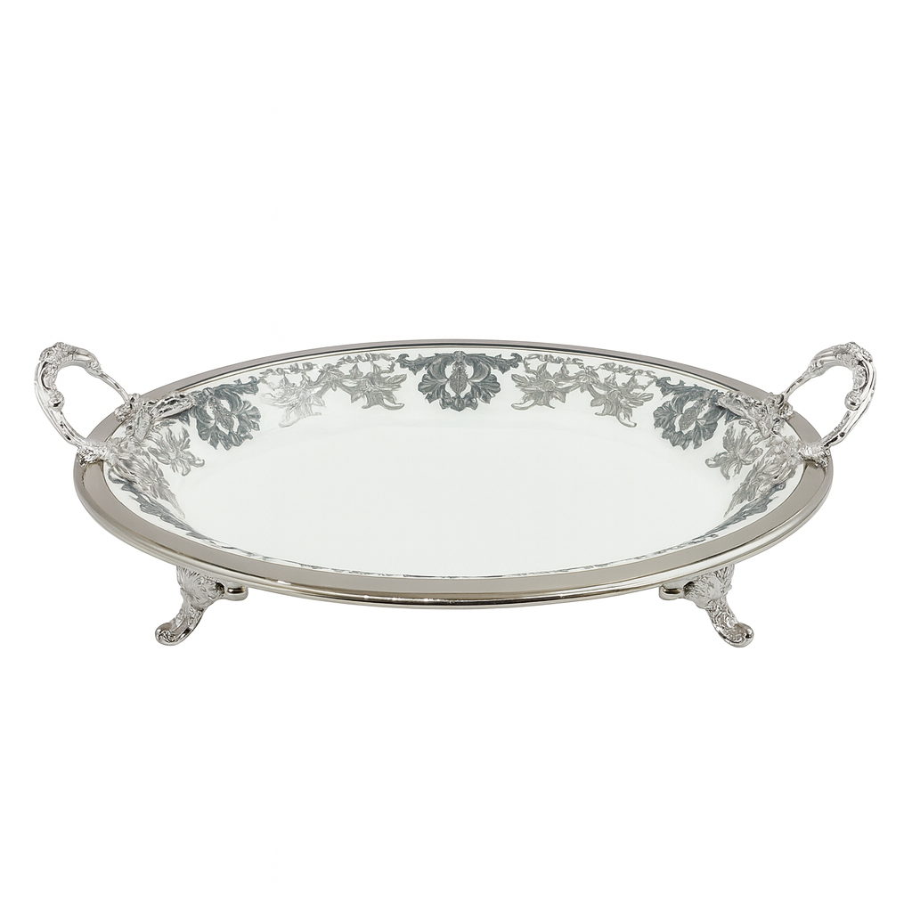 Add a touch of timeless elegance to your table setting with this beautifully crafted Round Serving Dish, available in 26 cm and 31 cm sizes. Designed with intricate silver-toned floral detailing and ornate handles and legs, it blends luxury with practicality—perfect for serving sweets, snacks, desserts, dry fruits, or for use as a centerpiece.