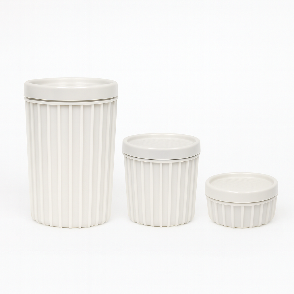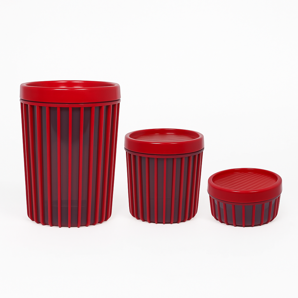 Keep your kitchen and home organized with this stylish Set of 3 Storage Jars with Lids. Designed with a ribbed modern finish, these durable containers are perfect for storing dry goods, snacks, pulses, tea, coffee, or household essentials. The airtight lids help keep contents fresh, while the stackable design saves space. Available in Green, White, Red, and Grey, these jars add both functionality and elegance to your storage solutions.