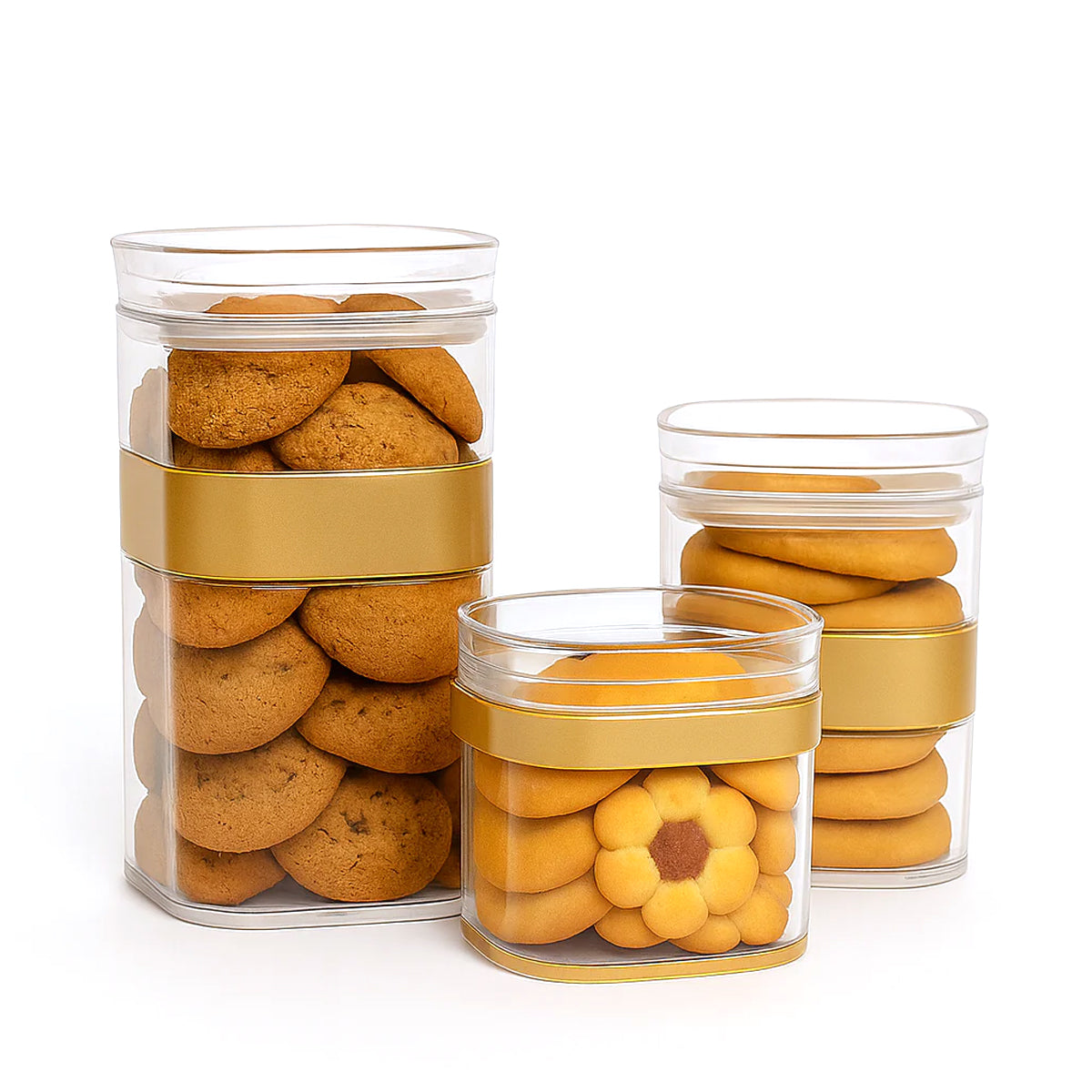 Keep your kitchen beautifully organized with the Sparkle Acrylic Jar Gift Pack, a stylish set of three premium storage containers. Designed with a crystal-clear body and accented by a chic golden band, these jars bring both elegance and functionality to your pantry or countertop. Perfect for gifting or everyday use, they are ideal for storing dry fruits, snacks, cookies, spices, pulses, or other kitchen essentials. Durable, lightweight, and safe, this set is an excellent choice for both modern homes and thoughtful gifting.