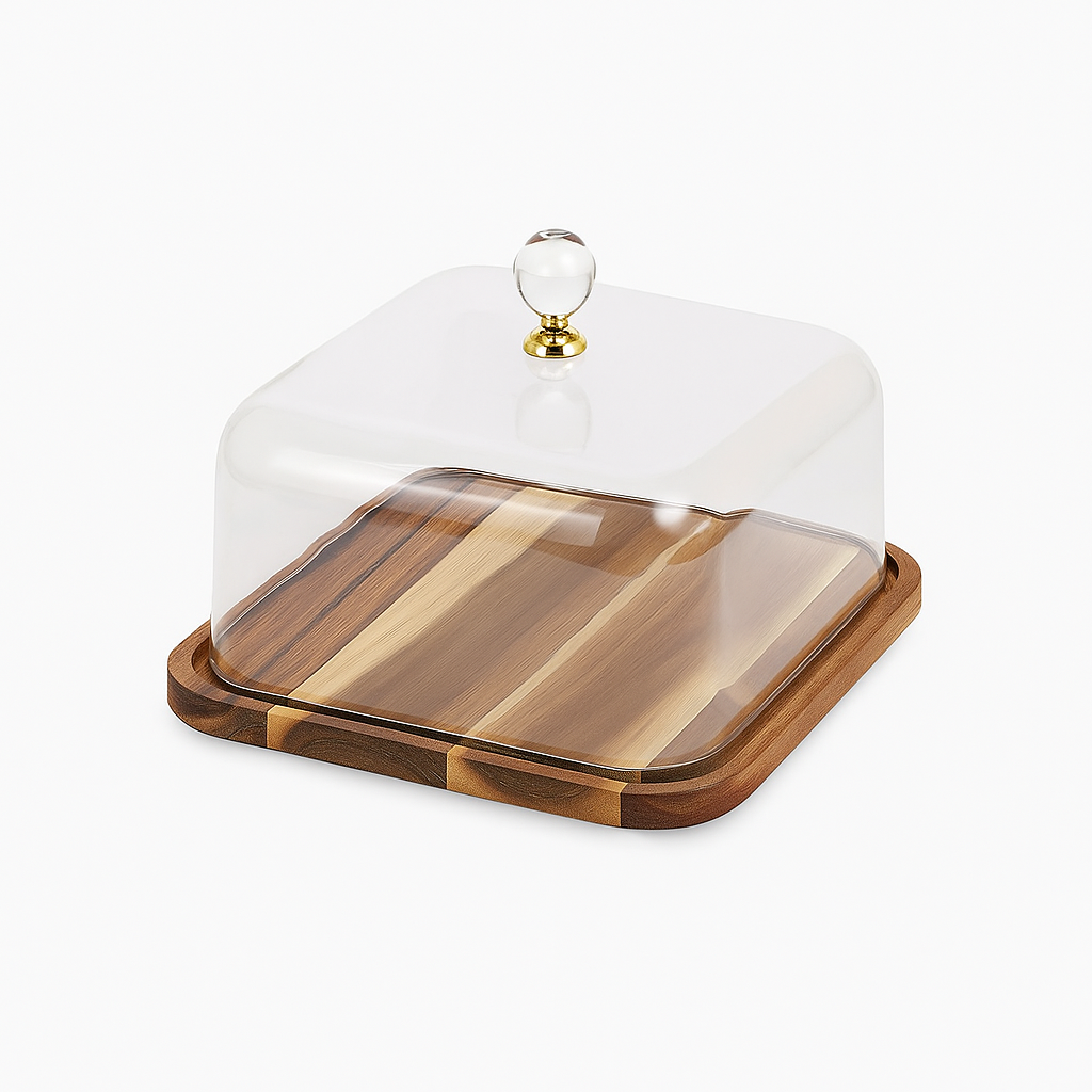 Square Wooden Cake Dish with Glass Dome | Elegant Dessert & Cheese Display Stand Showcase your cakes, pastries, or cheeses in style with this square wooden cake dish featuring a clear glass dome and a chic pearl-style handle. The natural wood base brings warmth and texture, while the transparent cover keeps your treats fresh and beautifully displayed.