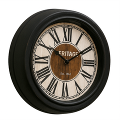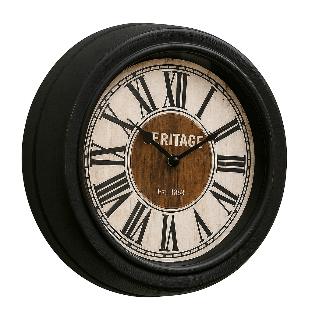 Bring a touch of timeless sophistication to your home with the Squat Wall Clock (10.75"), a compact yet striking piece designed to complement both traditional and modern interiors. The clock features a matte black plastic frame paired with a two-tone wood and cream dial, adorned with bold black Roman numerals and elegant vintage-style hands. Its Heritage Est. 1863 design adds an element of nostalgia, evoking a sense of classic craftsmanship.