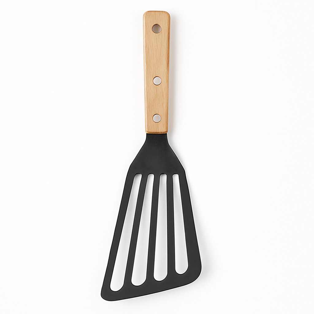 Stainless Steel Kitchen Spatula with Wooden Handle – Durable Cooking Stainless Steel Wooden Handle Spatula is a reliable, heat-resistant kitchen tool designed for effortless flipping, lifting, and serving. Its slotted stainless-steel head ensures smooth drainage of oil or liquids, while the sturdy wooden handle provides a comfortable, secure grip for everyday cooking. Stainless steel slotted cooking spatula with wooden handle for frying, flipping, and daily kitchen use.