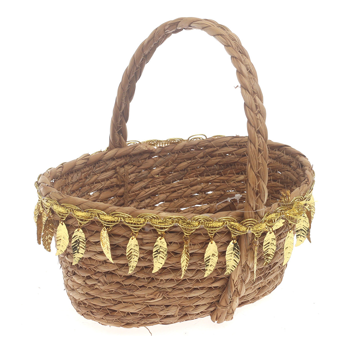 Bring natural charm and elegant detailing to your home with this medium brown handwoven storage basket. Featuring a beautifully braided body and a sturdy upright handle, this basket is accented with delicate gold-toned leaf embellishments around the rim for a refined decorative touch. Compact yet eye-catching, it works perfectly as both a functional organizer and a décor accent for shelves, dressers, or tabletops. Its artisanal look complements boho, festive, and earthy interior styles effortlessly.