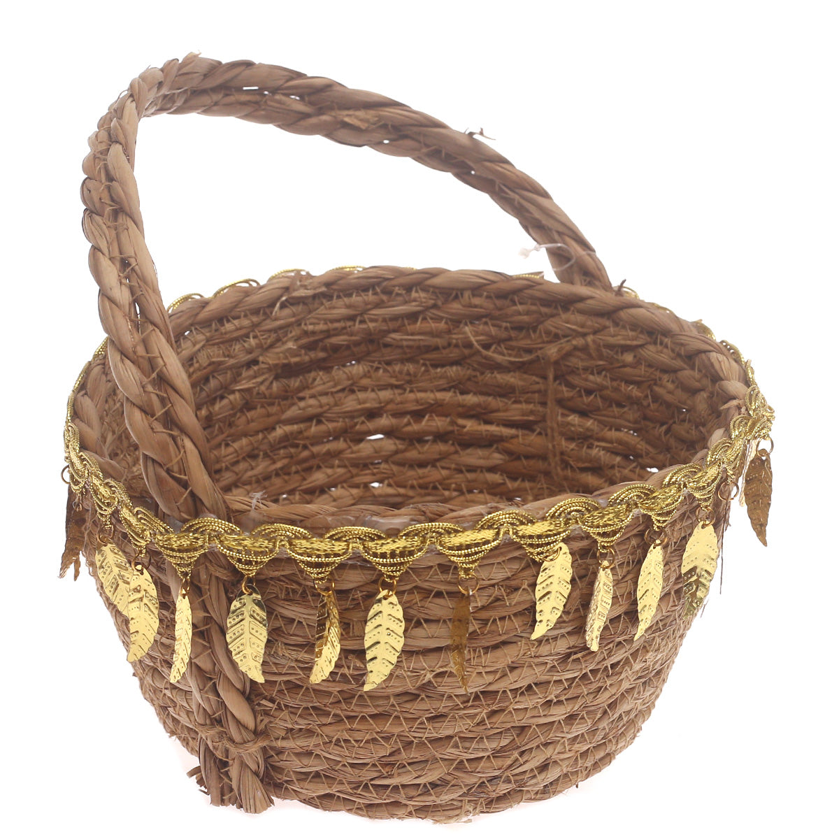 Elevate your storage and décor with this medium brown handwoven storage basket, beautifully crafted with a rounded silhouette and a sturdy braided handle. The basket is accented with elegant gold-toned leaf embellishments along the rim, adding a subtle festive and artisanal charm. Compact yet visually striking, it functions perfectly as both a practical organizer and a decorative accent, making it ideal for boho, ethnic, or contemporary interiors.