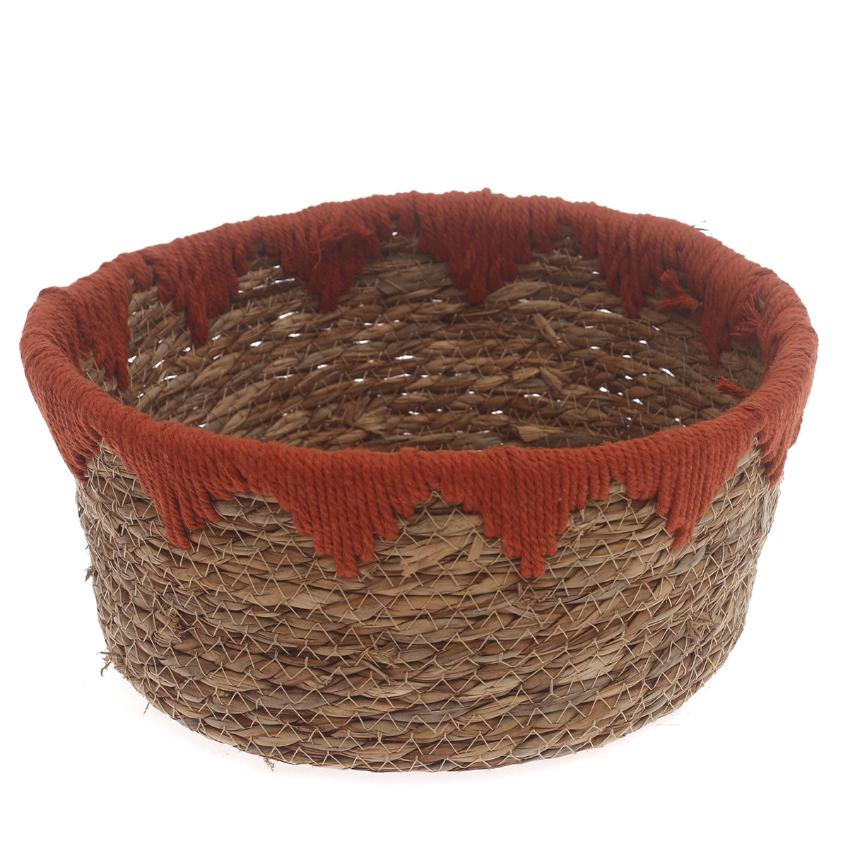 Infuse your space with earthy warmth and artisanal character using this medium rust storage basket. Handwoven with natural fibers and finished with a rich rust-toned yarn accent along the rim, this basket offers a beautiful blend of texture and color. Its rounded silhouette and handcrafted detailing make it a versatile piece that works equally well as functional storage or a decorative accent. Perfect for boho, rustic, or contemporary interiors, it adds charm while keeping everyday essentials neatly organized.