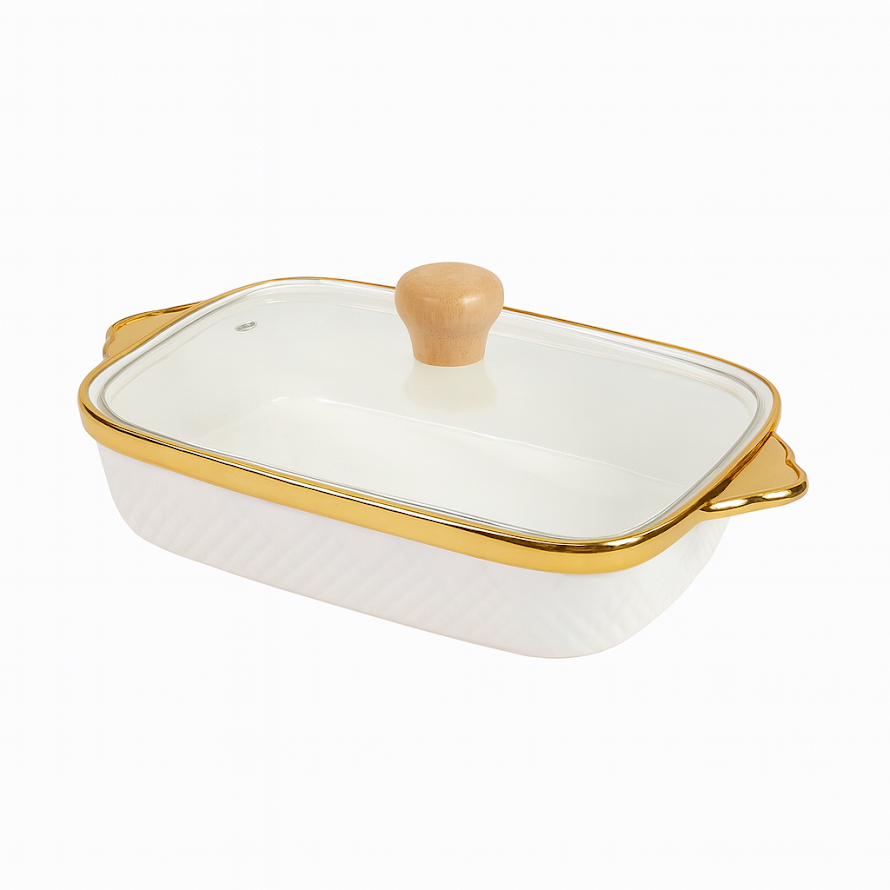 A sophisticated rectangular serving dish designed with a glossy white ceramic base, elegant gold trim, and a clear glass lid topped with a wooden handle. Perfect for serving casseroles, baked dishes, or festive meals in refined style.